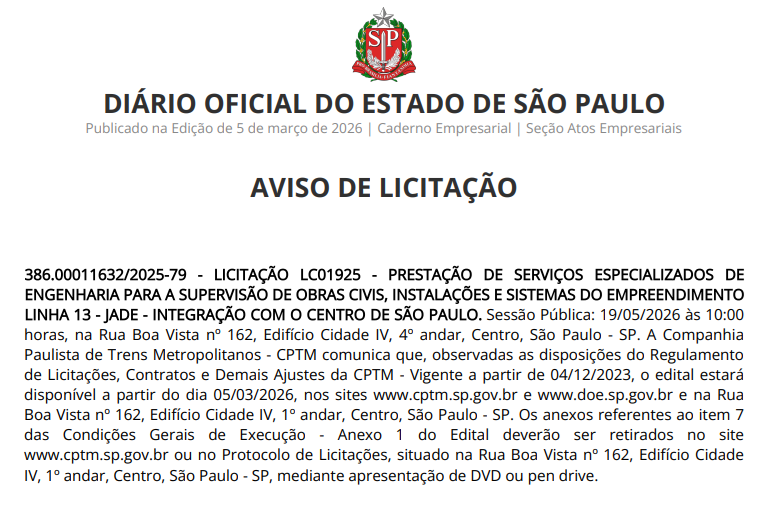 A Companhia Paulista de Trens Metropolitanos (CPTM) abriu licitação para contratar serviços especializados de engenharia destinados à supervisão das obras do empreendimento Linha 13-Jade – Integração com o Centro de São Paulo.