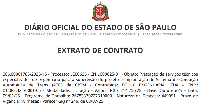 A CPTM publicou nesta terça-feira (13) no Diário Oficial do Estado de São Paulo o extrato do contrato com a empresa Pólux Engenharia para a prestação de serviços técnicos especializados de engenharia voltados à supervisão do projeto e da implantação do Sistema de Operação Automática de Trens (ATO). O valor do contrato é de R$ 6,21 milhões e o prazo de vigência é de 18 meses.