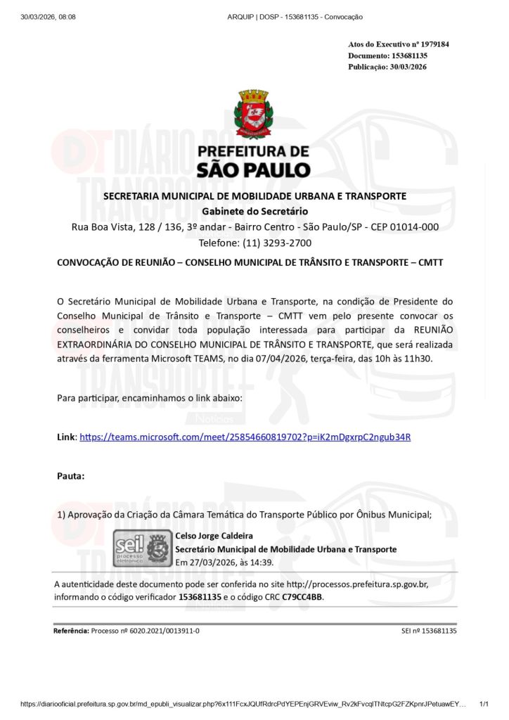 A convocação, assinada pelo secretário Municipal de Mobilidade Urbana e Transporte, Celso Jorge Caldeira, em Diário Oficial.