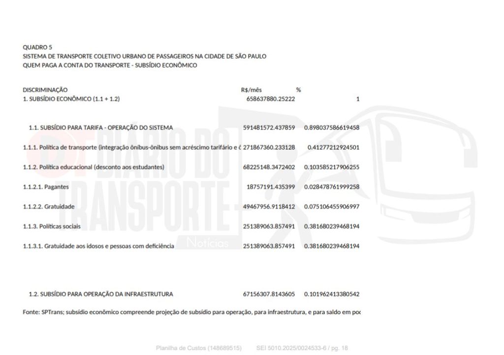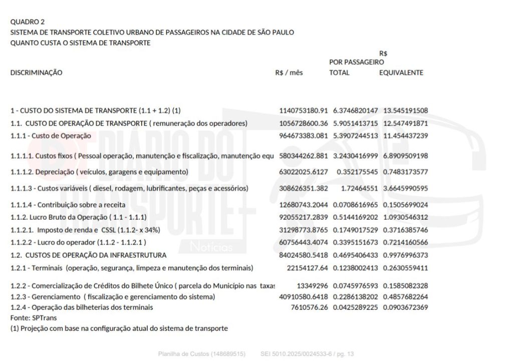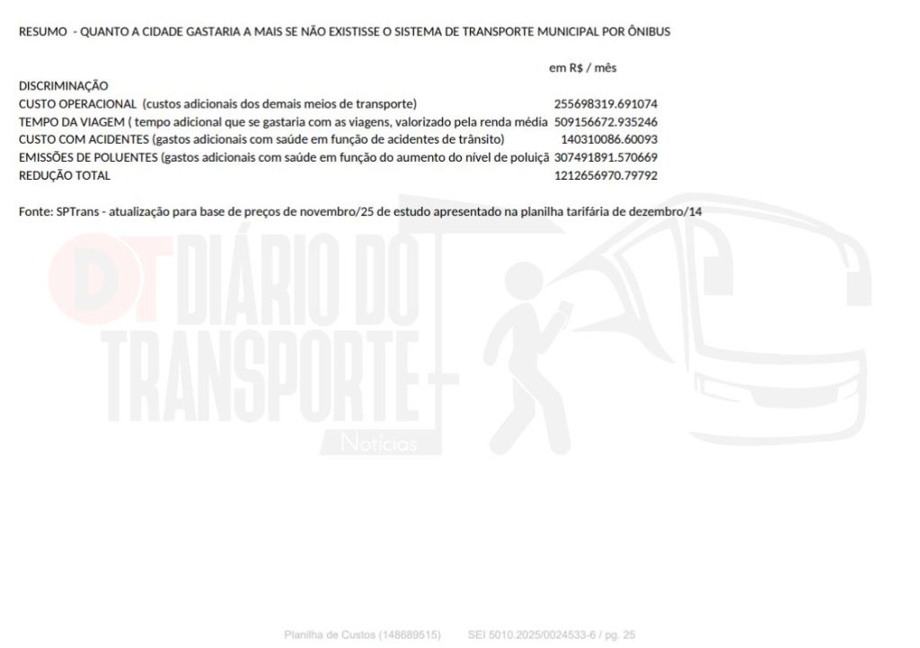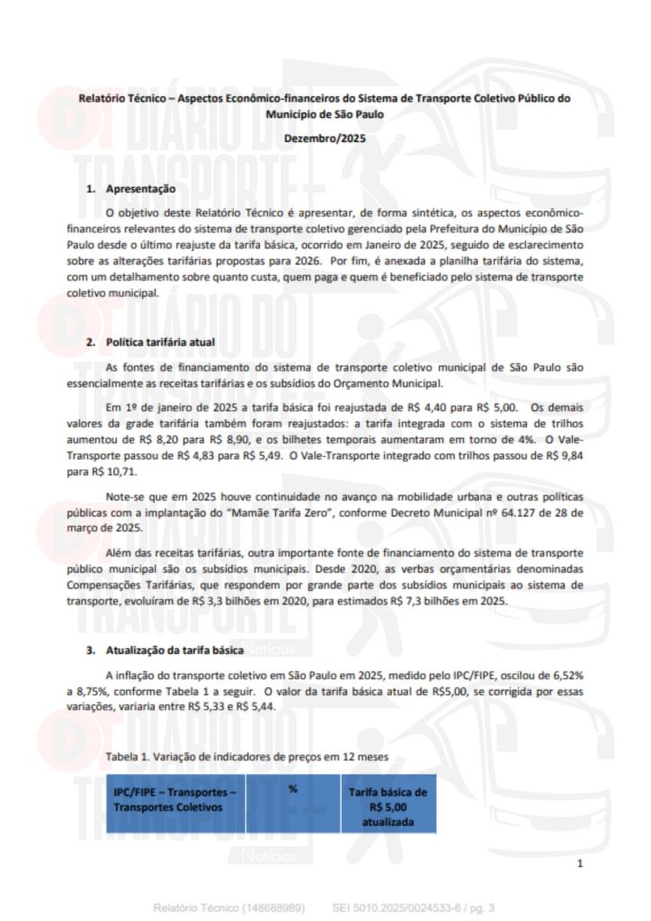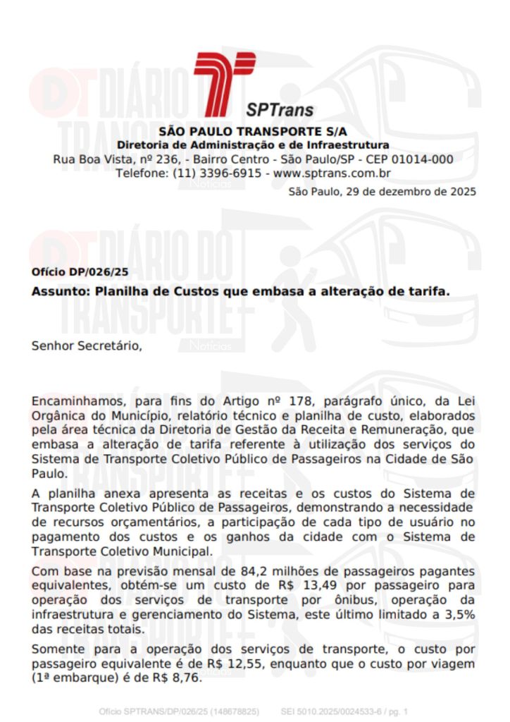 Os dados foram apresentados nesta sexta-feira, 02 de janeiro de 2026, ao CMTT – Conselho Municipal de Transporte e Trânsito, na qual a SPTrans (São Paulo Transporte), gerenciadora do sistema de ônibus da capital paulista explicou os custos de operação e manutenção e as justificativas para o aumento da tarifa, que passa de R$ 5 para 5,30 em 06 de janeiro de 2026.