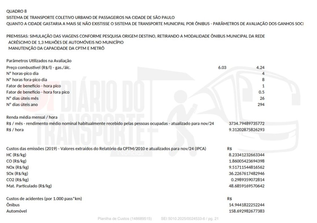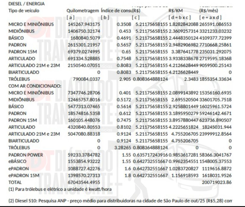 A tabela da SPTrans leva em conta o Diesel S10 com base Pesquisa ANP – preço médio para distribuidoras na cidade de São Paulo de out/25 (R$5,28).