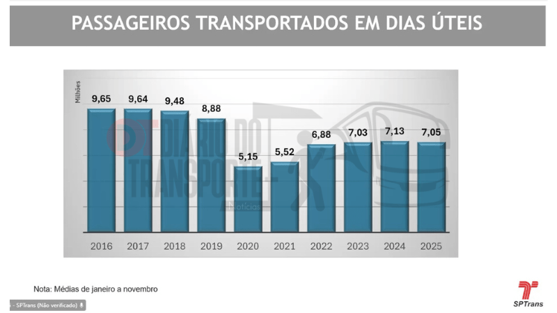 segundo os dados aos quais o Diário do Transporte teve acesso, o número de passageiros caiu na projeção de 2025, em média, 19,5%, comparando com que foi transportado em 2019. Foram 2,6 bilhões (2 bilhões 638 milhões 190 mil 764) registros de passagens em 2019. Em 2025, a projeção é de 2,1 bilhões (2.122.261.193), sendo que o pior cenário, por causa dos reflexos da pandemia, foi em 2020, com 1,5 bilhão; e 202, com 1,6 bilhão de registros de passagens.