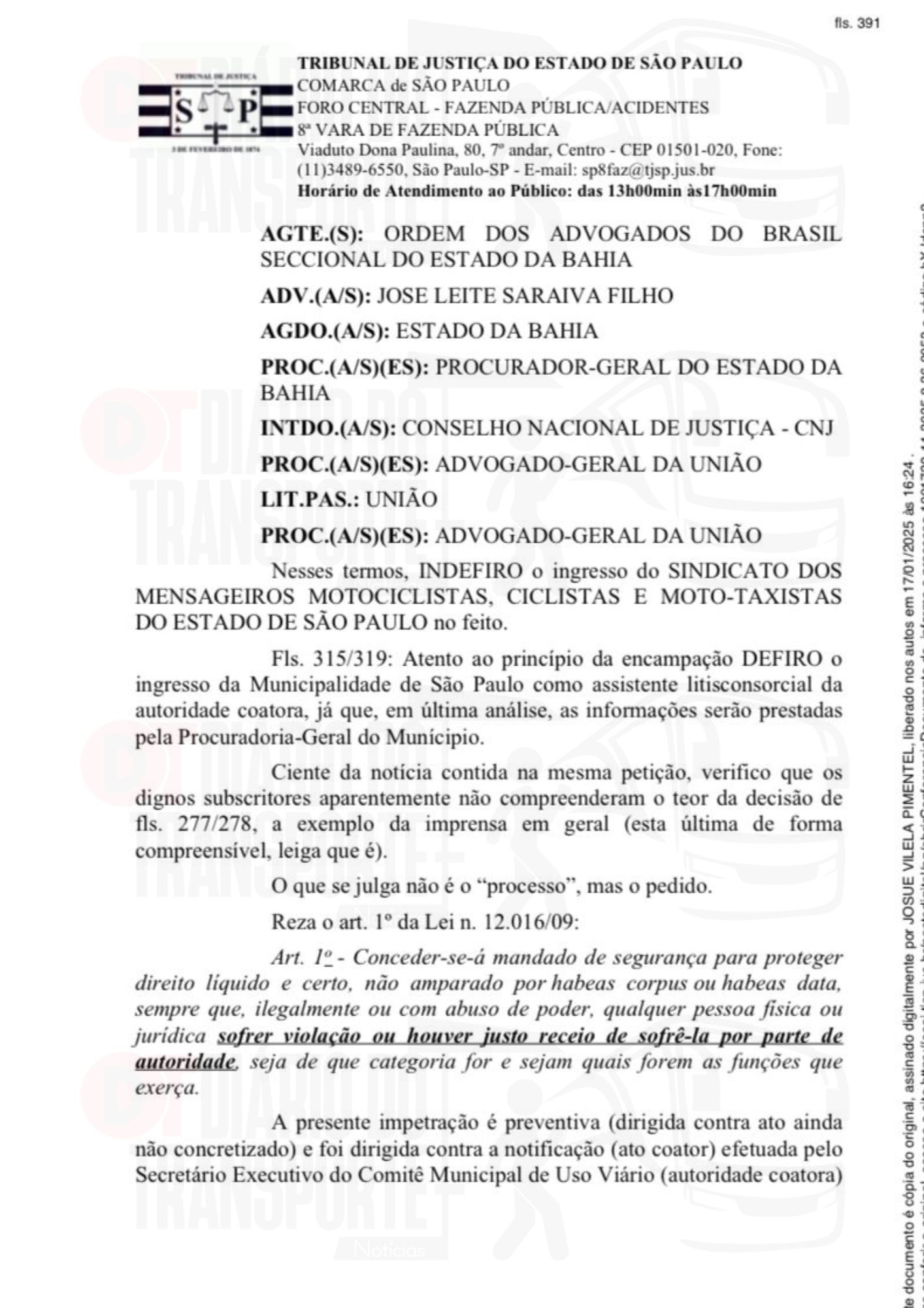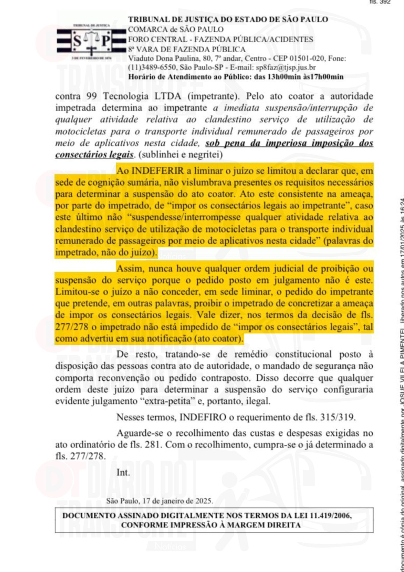 Ao INDEFERIR a liminar o juízo se limitou a declarar que, em sede de cognição sumária, não vislumbrava presentes os requisitos necessários para determinar a suspensão do ato coator. Ato este consistente na ameaça, por parte do impetrado, de “impor os consectários legais ao impetrante”, caso este último não “suspendesse/interrompesse qualquer atividade relativa ao clandestino serviço de utilização de motocicletas para o transporte individual remunerado de passageiros por meio de aplicativos nesta cidade” (palavras do impetrado, não do juízo). Assim, nunca houve qualquer ordem judicial de proibição ou suspensão do serviço porque o pedido posto em julgamento não é este. Limitou-se o juízo a não conceder, em sede liminar, o pedido do impetrante que pretende, em outras palavras, proibir o impetrado de concretizar a ameaça de impor os consectários legais. Vale dizer, nos termos da decisão de fls. 277/278 o impetrado não está impedido de “impor os consectários legais”, tal como advertiu em sua notificação (ato coator). – diz a decisão desta sexta-feira (17).