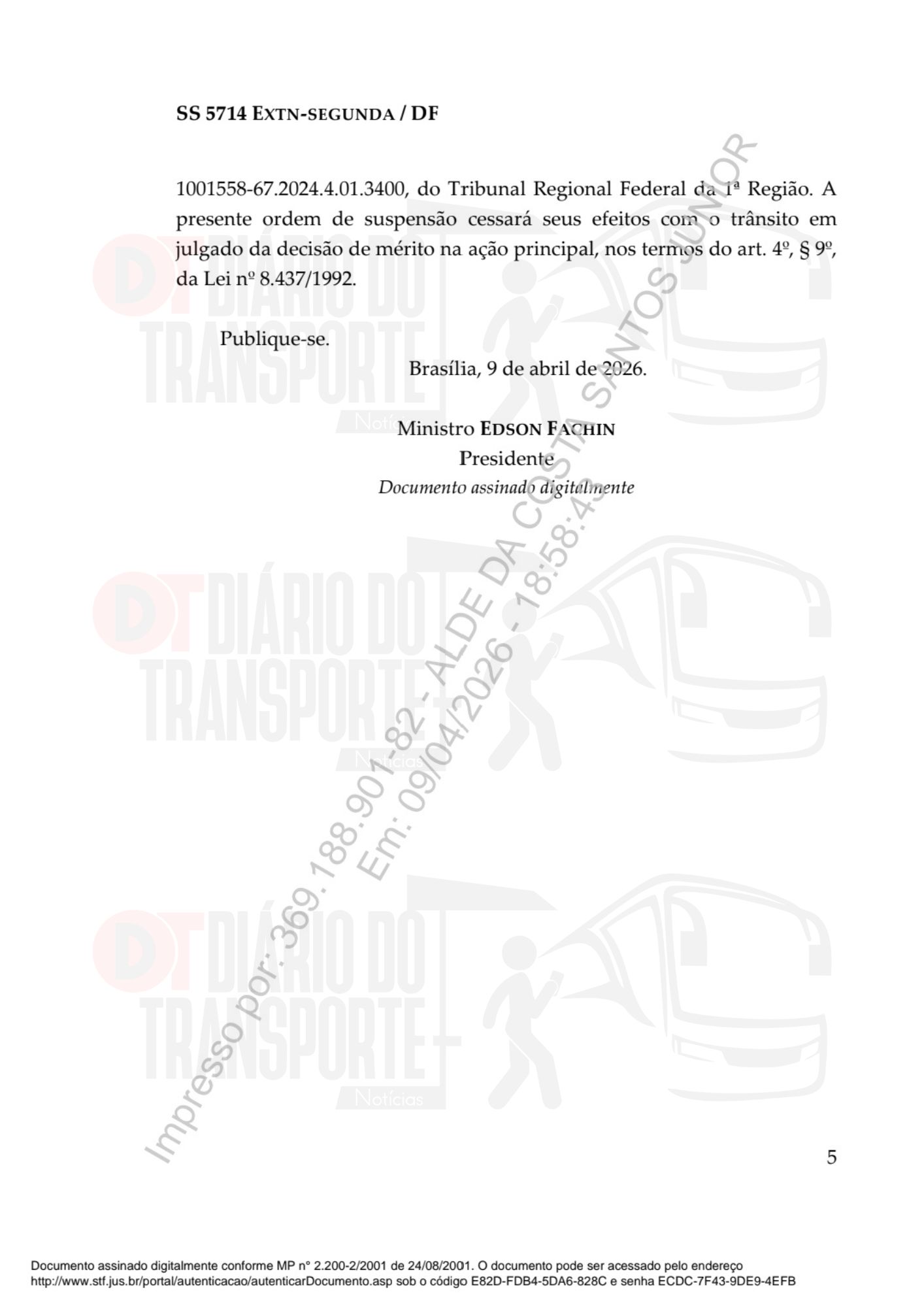 O Diário do Transporte noticiou que uma decisão do ministro-presidente do Supremo Tribunal Federal, Edson Fachin, de 09 de abril de 2026, confirmou a aplicação do marco regulatório sobre as linhas de ônibus interestaduais rodoviárias regulares.