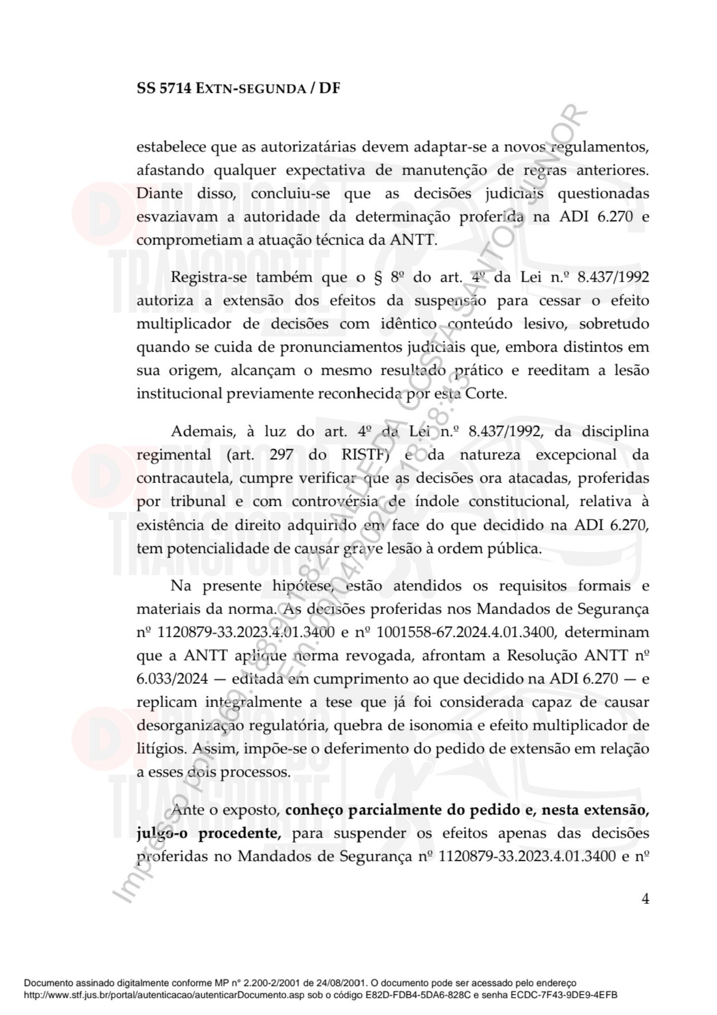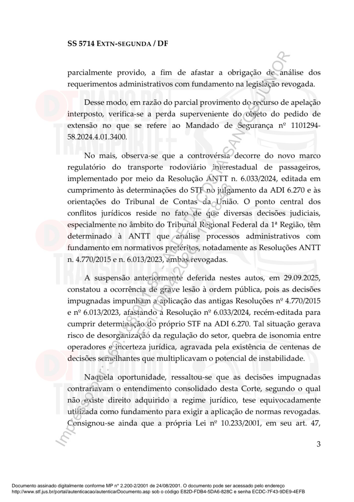 A decisão trata exclusivamente da Resolução ANTT nº 6.033/2024, que regula o transporte rodoviário regular interestadual. Em nenhum momento desta decisão o STF analisou, mencionou ou se pronunciou sobre fretamento colaborativo. A suspensão de segurança deferida refere-se a decisões do TRF1 que obrigavam a ANTT a aplicar normas no contexto do transporte regular — modalidade distinta e com regime jurídico próprio.
