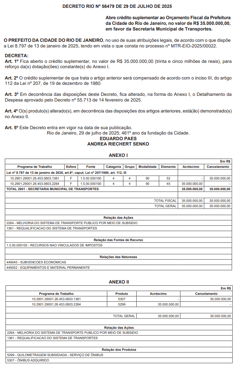 O Diário Oficial do Município do Rio de Janeiro, na edição desta quarta-feira, 30 de julho de 2025, publicou decreto do Prefeito Eduardo Paes abrindo um crédito suplementar em favor da Secretaria Municipal de Transportes no valor de R$ 35 milhões.