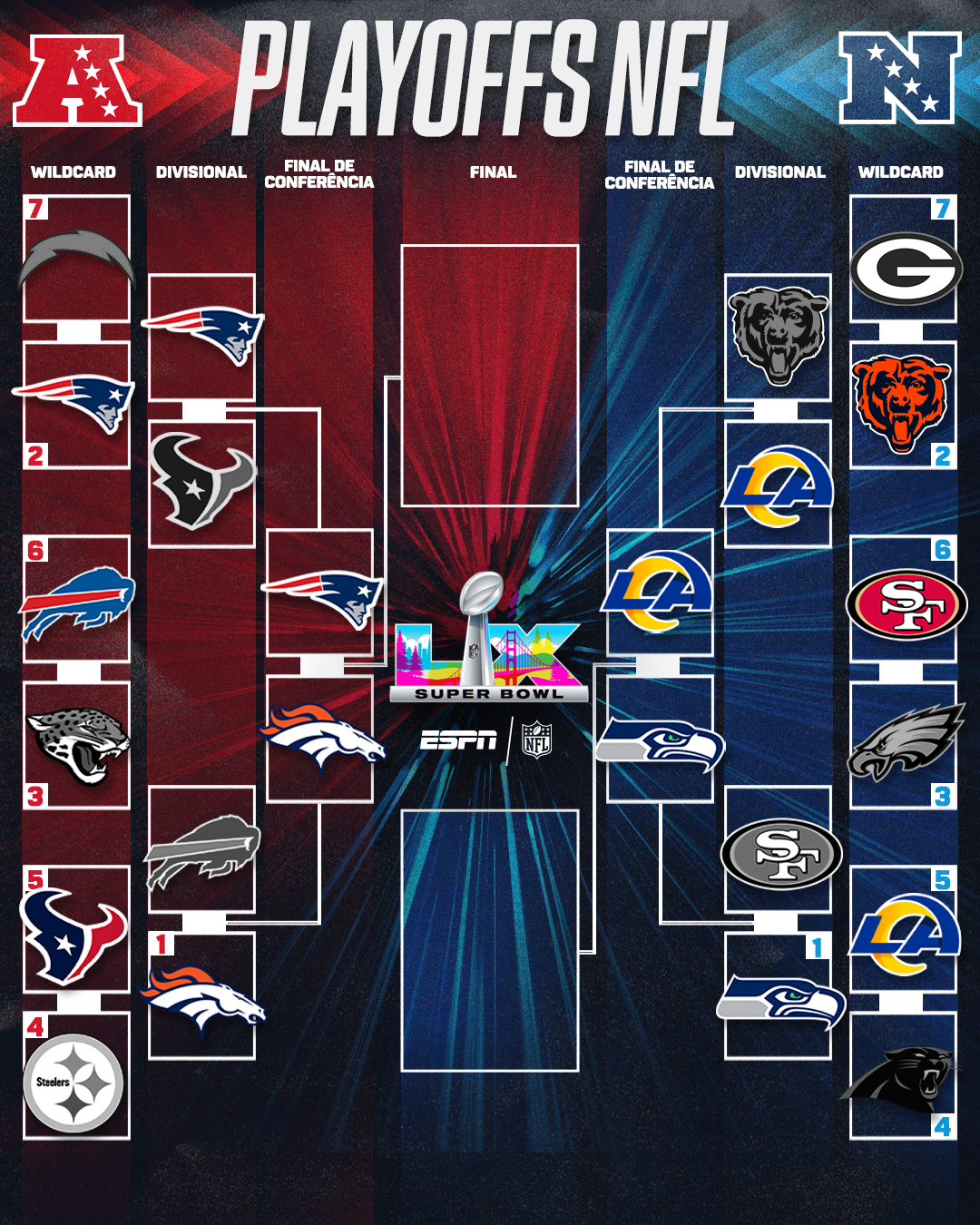 O caminho para o Super Bowl LX está mais próximo na NFL. Neste domingo (18), foram definidas as finais das conferências que decidirão as vagas para o principal evento do ano da bola oval, que acontece no dia 8 de fevereiro, no Levi’s Stadium, em Santa Clara, na Califórnia, com transmissão ao vivo no plano premium do Disney+.