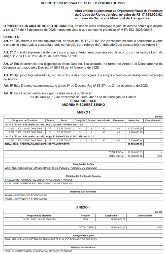 A Prefeitura do Rio de Janeiro abriu crédito suplementar de R$ 17.728.020,62 em favor da Secretaria Municipal de Transportes (SMTR) para reforçar o subsídio ao sistema municipal de ônibus. A medida consta do Decreto Rio nº 57.424, de 12 de dezembro de 2025, assinado pelo prefeito Eduardo Paes, e direciona recursos exclusivamente para a política de compensação financeira por quilômetro rodado, utilizada para sustentar a operação do transporte coletivo urbano.