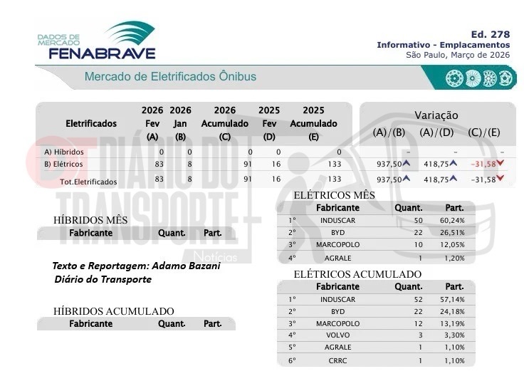 No acumulado do ano, entre todas as marcas, o mercado de elétricos retraiu 31,58% em comparação com o primeiro bimestre de 2025, quando foram emplacados 133 coletivos não poluentes.