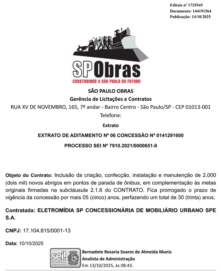 O novo aditamento, publicado pela São Paulo Obras (SPObras), inclui também a criação, confecção, instalação e manutenção de 2 mil novos abrigos, além de estender a vigência do contrato para 30 anos no total.