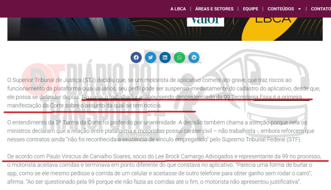 Numa postagem do site de 12 de julho de 2024, no site da LBCA, o escritório cita uma notícia sobre uma decisão do Superior Tribunal de Justiça (STJ) que permitiu o descredenciamento de um motorista acusado de cometer ato grave, que trouxe riscos ao funcionamento da plataforma ou a usuários