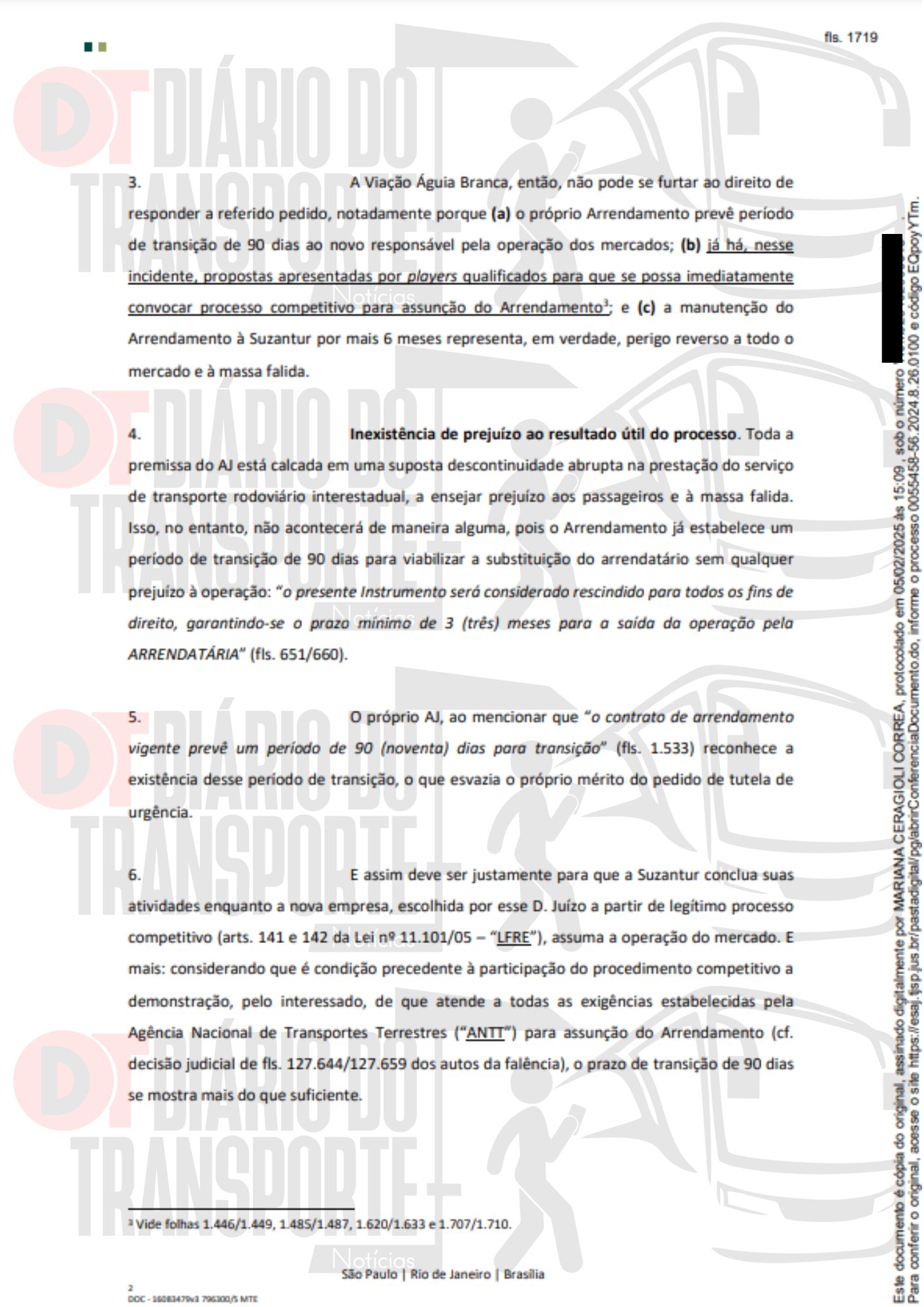 A Viação Águia Branca, então, não pode se furtar ao direito de responder a referido pedido, notadamente porque (a) o próprio Arrendamento prevê período de transição de 90 dias ao novo responsável pela operação dos mercados; (b) já há, nesse incidente, propostas apresentadas por players qualificados para que se possa imediatamente convocar processo competitivo para assunção do Arrendamento; e (c) a manutenção do Arrendamento à Suzantur por mais 6 meses representa, em verdade, perigo reverso a todo o mercado e à massa falida. – diz a Águia Branca que ainda reforça o pedido para que automaticamente o arrendamento para a Suzantur se encerre no dia 27 de fevereiro de 2025, que a empresa seja proibida de vender passagens para viagens depois desta data e, as que já vendeu, devolva o dinheiro para os usuários.