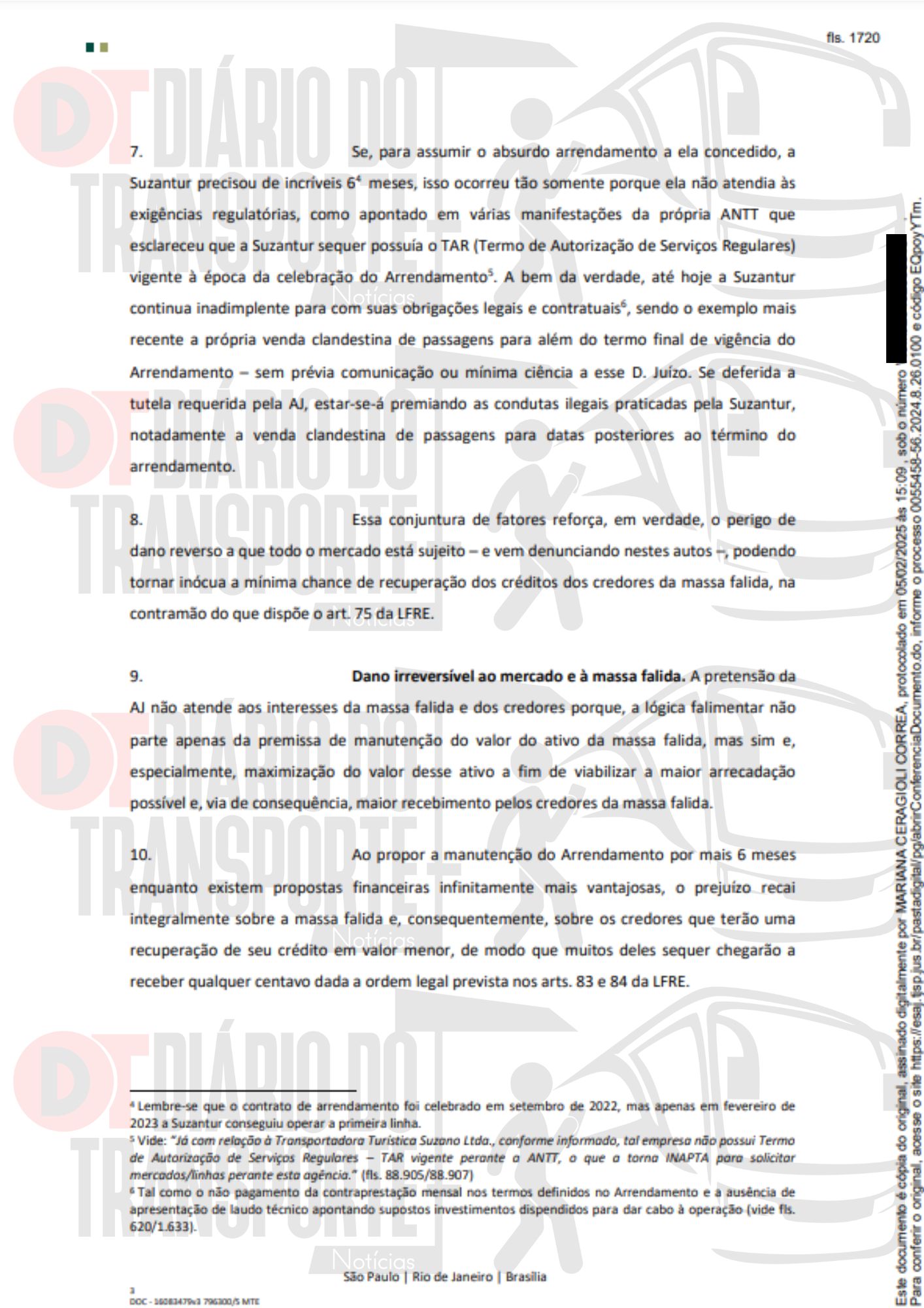 A administradora judicial argumenta ainda que as operações da Suzantur, desde o início, renderam aos credores do Grupo Itapemirim até dezembro de 2024, quase R$ 7 milhões em vendas de passagens, transportaram 1,8 milhão de passageiros e geraram cerca de 900 empregos.
