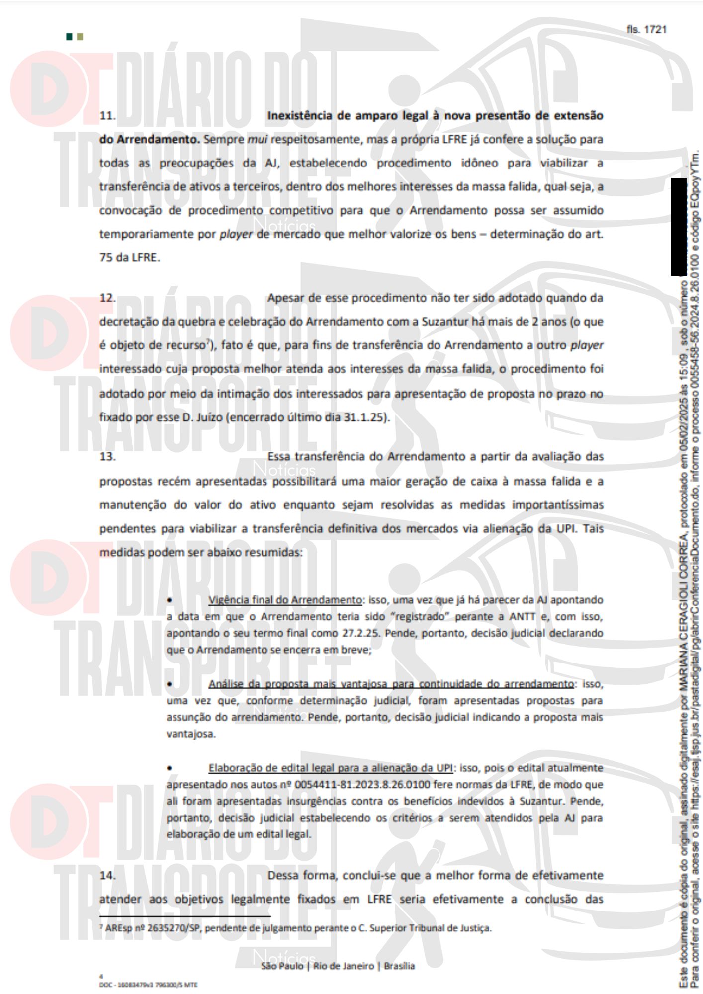 A administradora judicial da falência, EXM Partners, por sua vez, pede que o arrendamento atual seja prorrogado por mais 180 dias ou até a conclusão do leilão, caso isso ocorra antes dos seis meses extras pedido, como mostrou o Diário do Transporte. O pedido foi protocolado em 31 de janeiro de 2025.