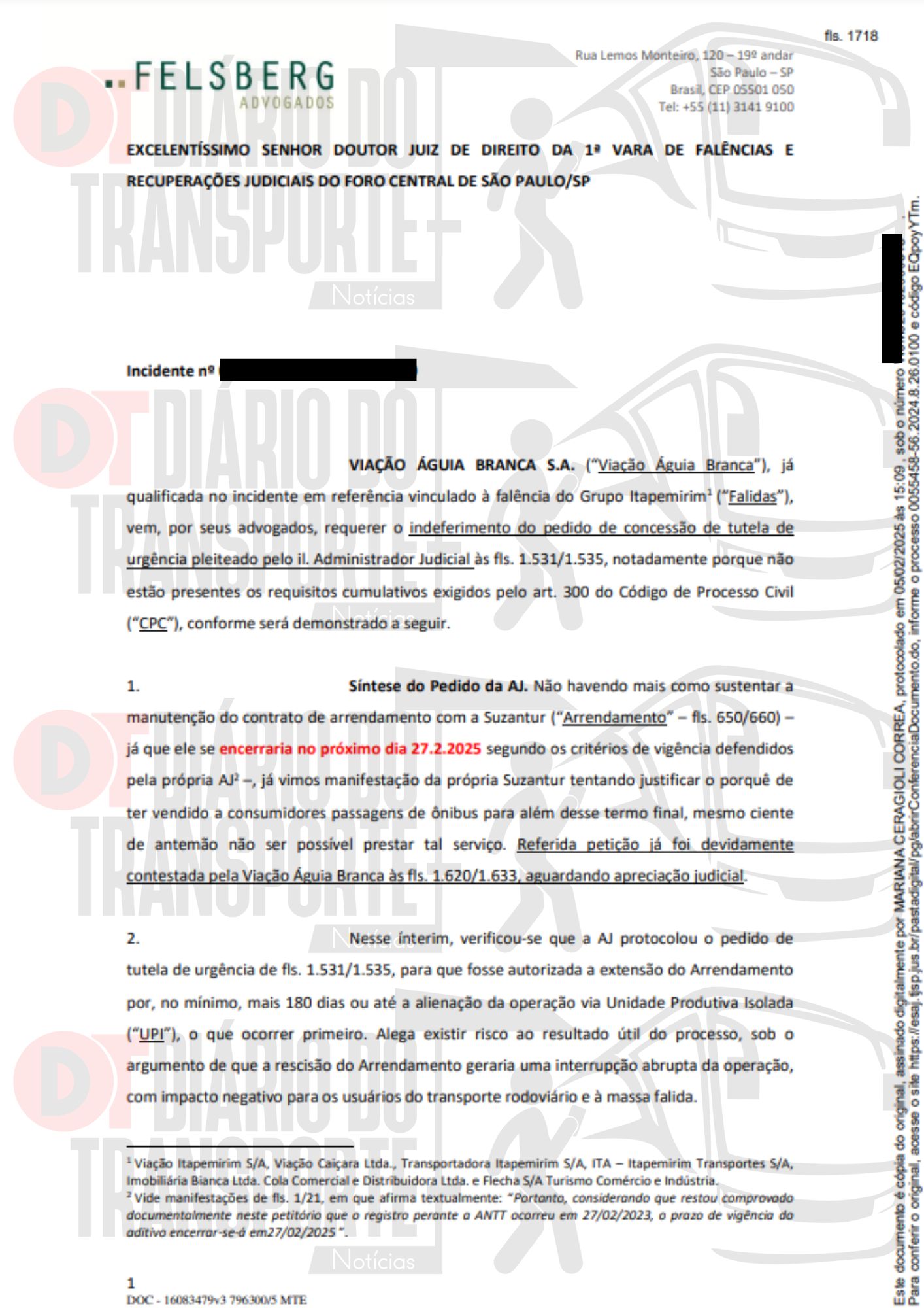 Na nova petição desta quarta-feira, 05 de fevereiro de 2025, a Águia Branca ainda quer que a Justiça negue pedido da administradora judicial da falência, EXM Partners, para prorrogar por mais seis meses o arrendamento à empresa do ABC Paulista, como havia mostrado o Diário do Transporte na última sexta-feira (31).