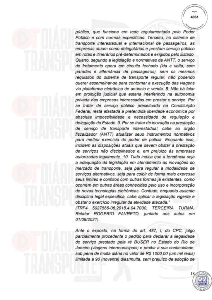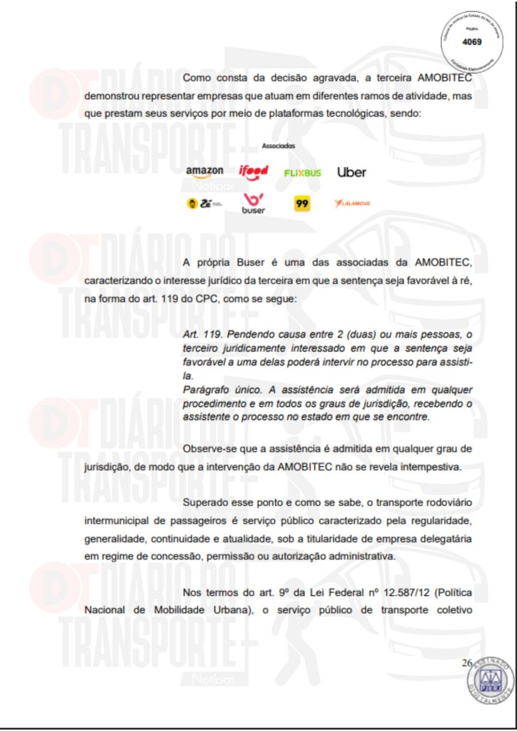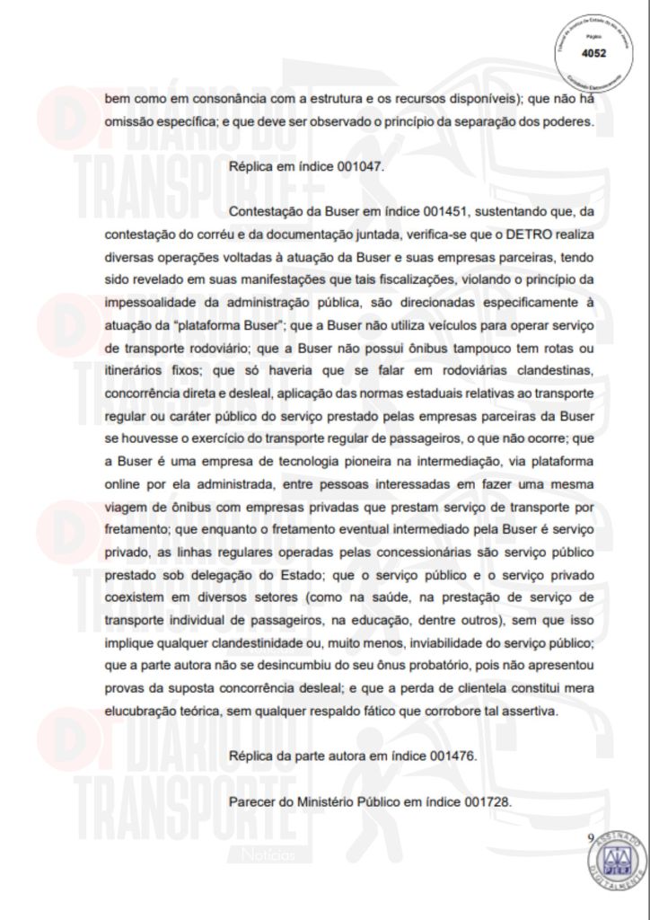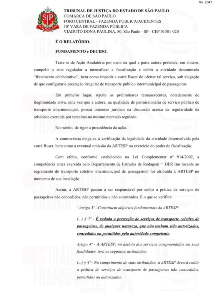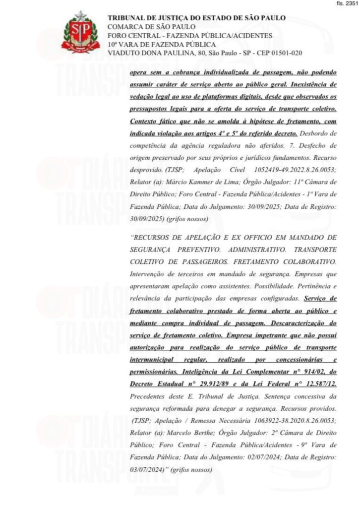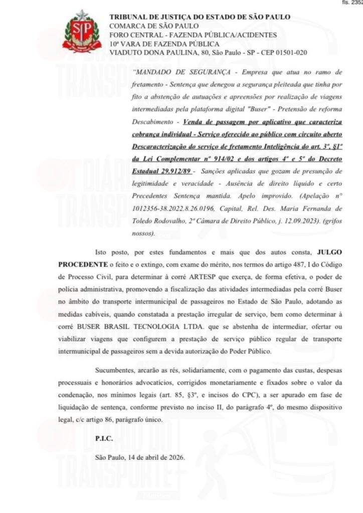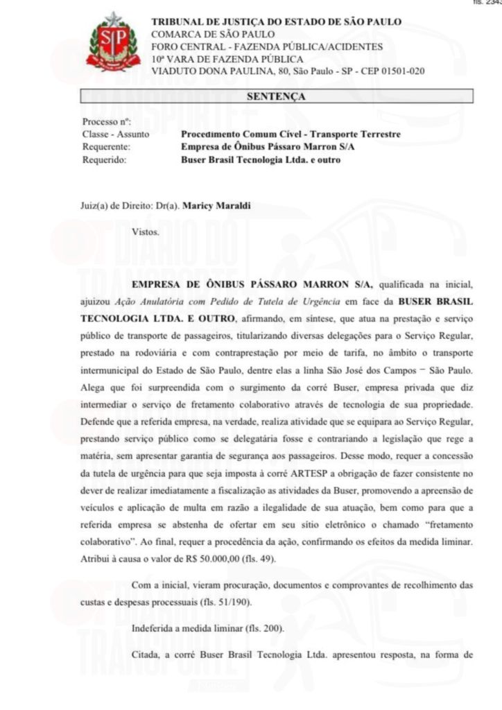 Em São Paulo, trata-se de um processo movido pela empresa de linhas regulares Pássaro Marron contra a Buser. A sentença, da juíza Maricy Maraldi, da 10ª Vara da Fazenda Pública, é de 14 de abril de 2026, sendo divulgada nesta quinta-feira (16).