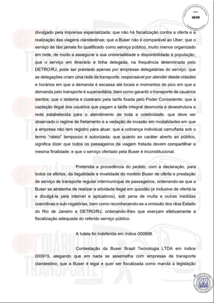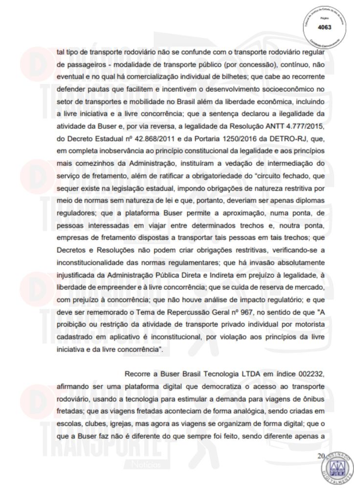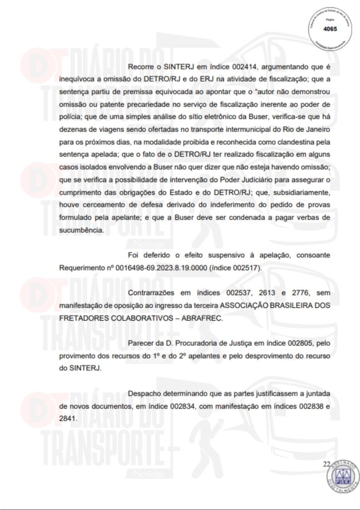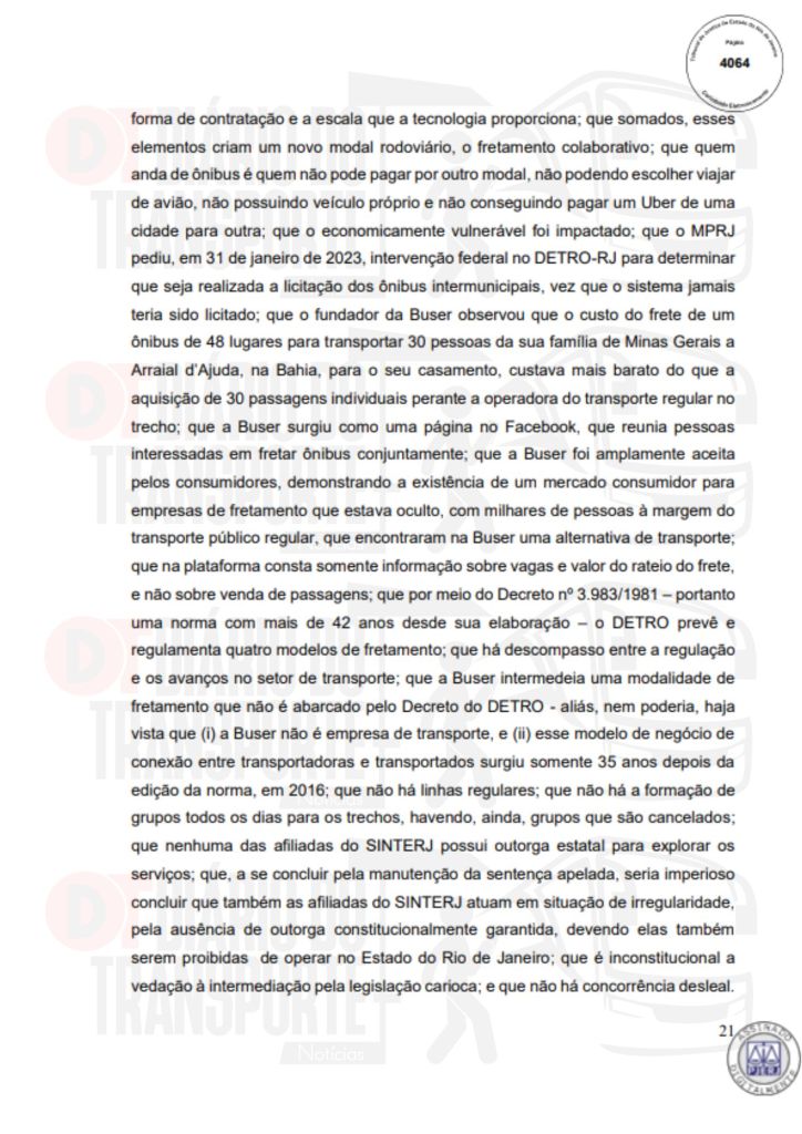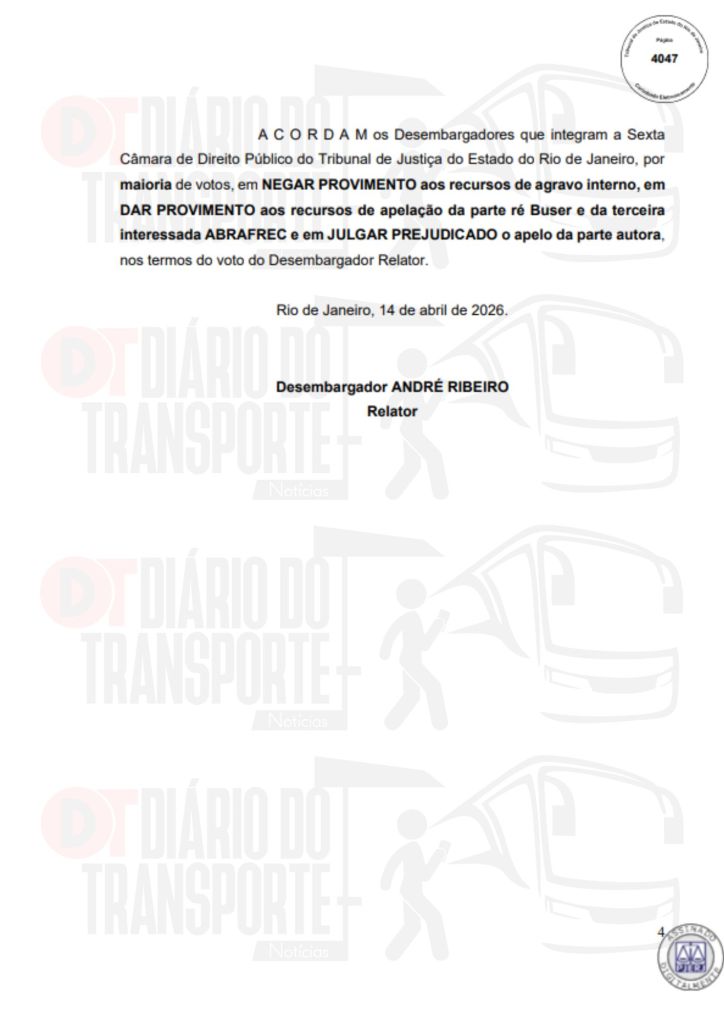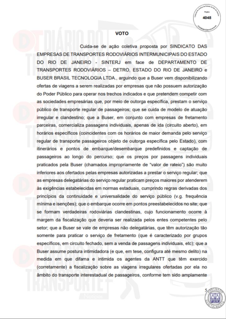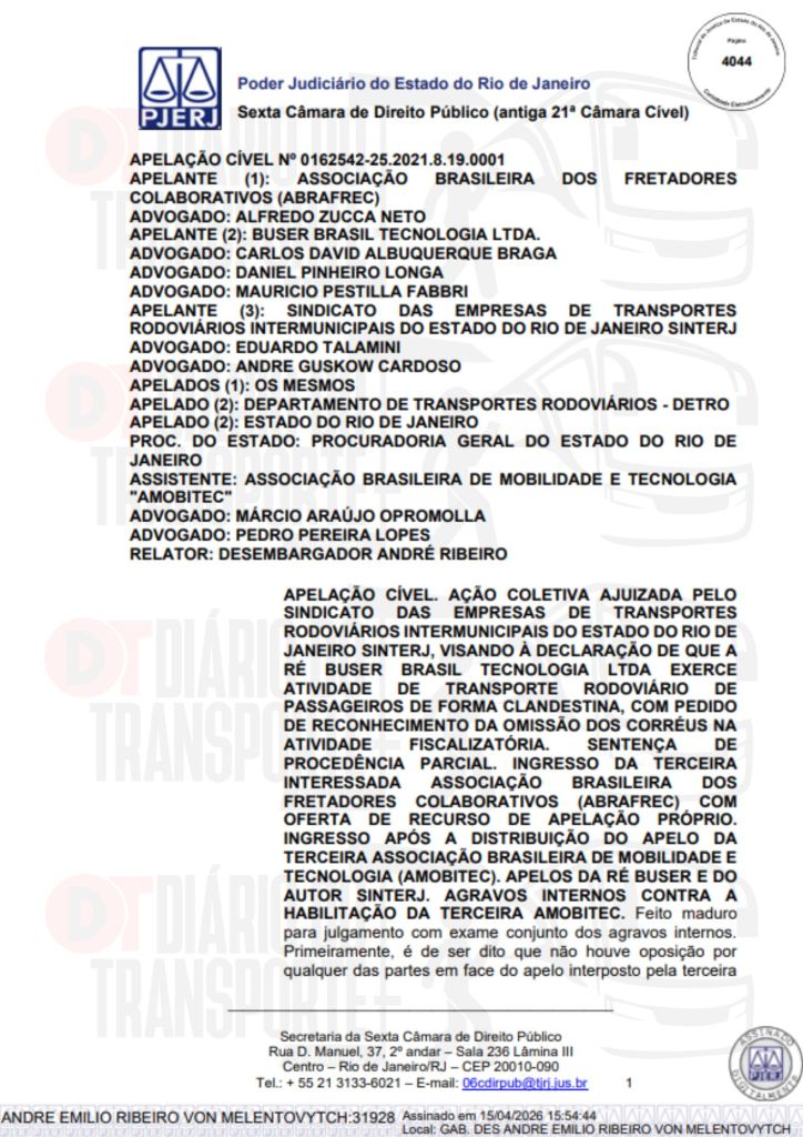 No Rio de Janeiro, acórdão da Sexta Câmara de Direito Público, também de 14 de abril de 2026, divulgado nesta quinta-feira (16), negou pedido do Sinterj (Sindicato das Empresas de Transportes Rodoviários do Estado do Rio de Janeiro) que alegaram que a Buser vem disponibilizando  ofertas de viagens a serem realizadas por empresas que não possuem autorização do Poder Público para operar nos trechos indicados e que pretendem competir com as viações de linhas regulares.