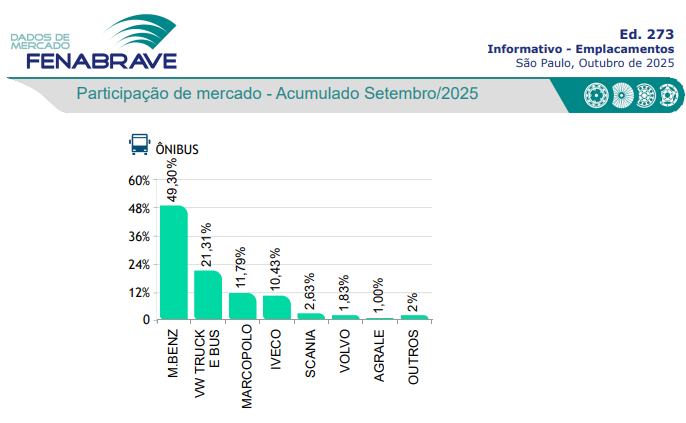 No mercado de ônibus como um todo, a Mercedes-Benz continua dominando, com 10.470 unidades emplacadas até setembro, quase metade de todo o volume nacional. A Volkswagen Truck & Bus aparece em segundo lugar, com 4.525 veículos, puxada por sua forte presença no programa Caminho da Escola.