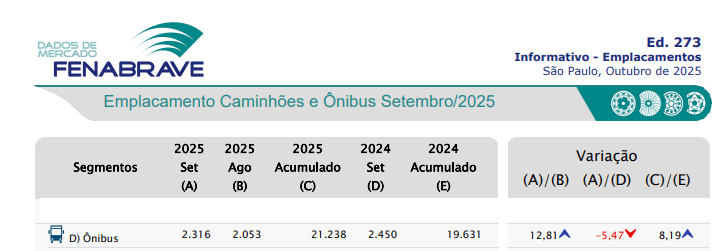 Mesmo com queda em setembro frente ao ano anterior, o acumulado mostra que o mercado de ônibus em 2025 segue em recuperação, sustentado por programas governamentais (como PAC e Caminho da Escola) e pela renovação gradual de frotas urbanas e de fretamento.
