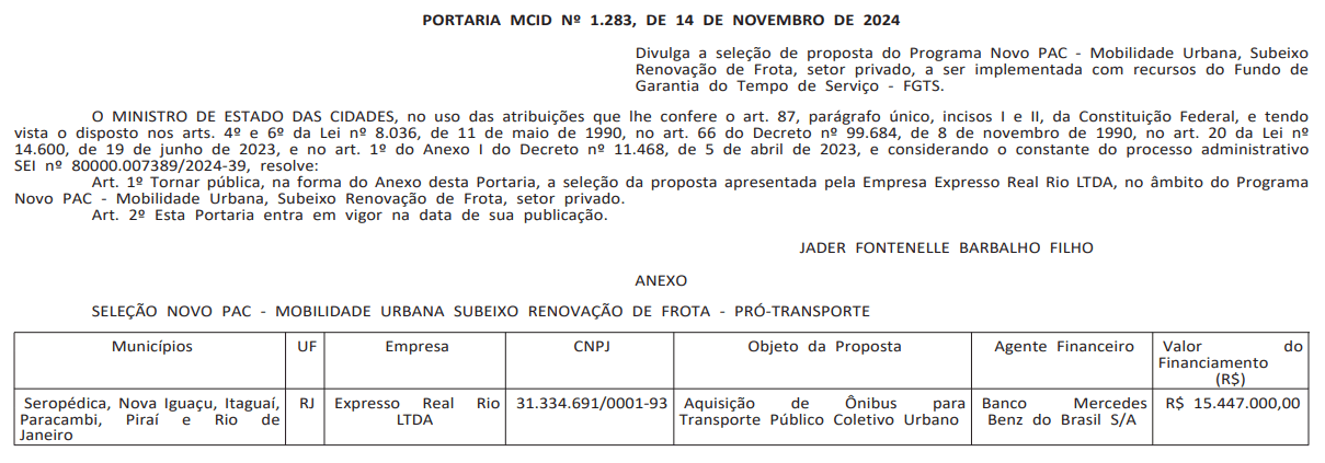 Duas empresas de ônibus do Rio de Janeiro foram selecionadas para receber financiamento do Programa Novo PAC para a renovação de suas frotas.