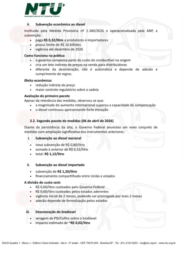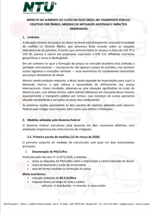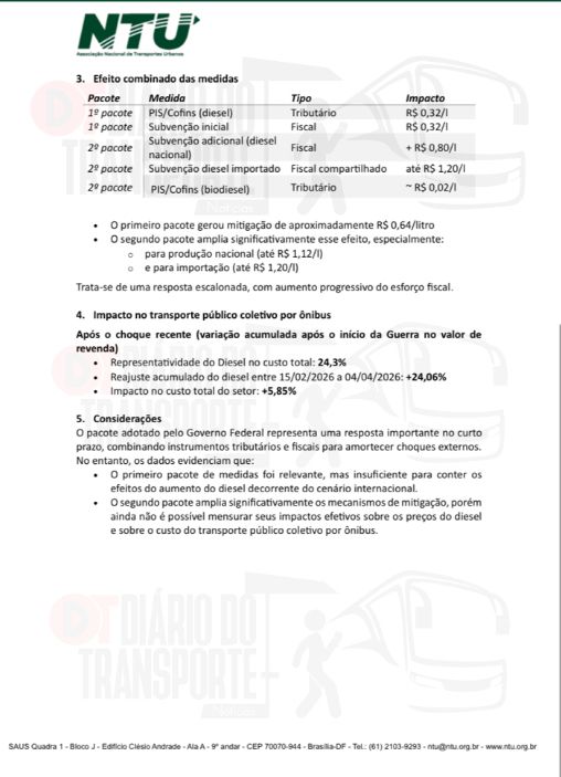 Já a NTU elaborou uma nota técnica na qual analisa as medidas tomadas até agora pelo Governo e os impactos das elevações do preço do diesel.