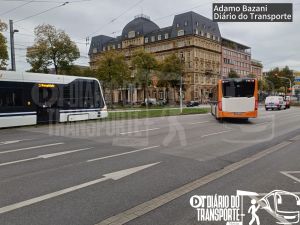 Ônibus (à esquerda) e VLT (mais ao fundo) em Mannheim, na Alemanha