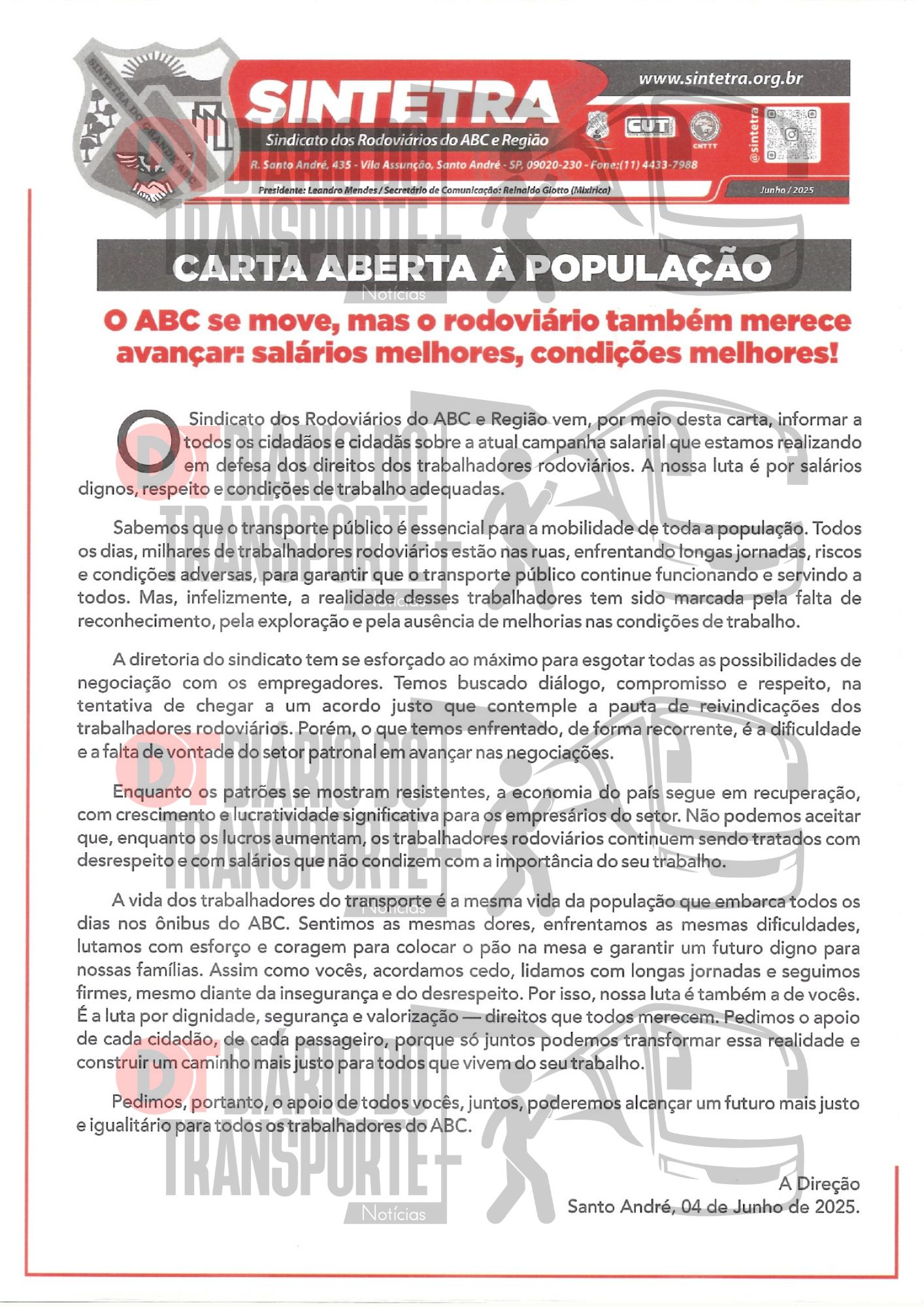 As companhias de ônibus que operam no ABC Paulista se pronunciaram na noite desta terça-feira, 04 de junho de 2025, sobre a decisão dos trabalhadores em assembleia realizada na parte da tarde e que rejeitou a nova contraproposta de reajustes nos salários e benefícios apresentada pelos empresários. (RESUMO: As empresas ressaltam que hoje o salário dos motoristas do ABC é o segundo maior da categoria em todo o País, superando R$ 4,2 mil, que a contraproposta supera a inflação acumulada e pedem bom senso do Sintetra para evitar que dezenas de milhares de pessoas sejam prejudicadas com uma greve de ônibus. – VEJA NOTA OFICIAL INTEIRA MAIS ABAIXO)