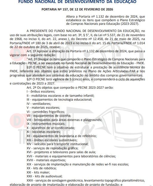 Portaria publicada nesta sexta-feira, 27 de fevereiro de 2026, que altera portaria anterior, confirma a inclusão dos “ônibus escolares sustentáveis” no Plano Estratégico de Compras Nacionais para Educação até 2027.
