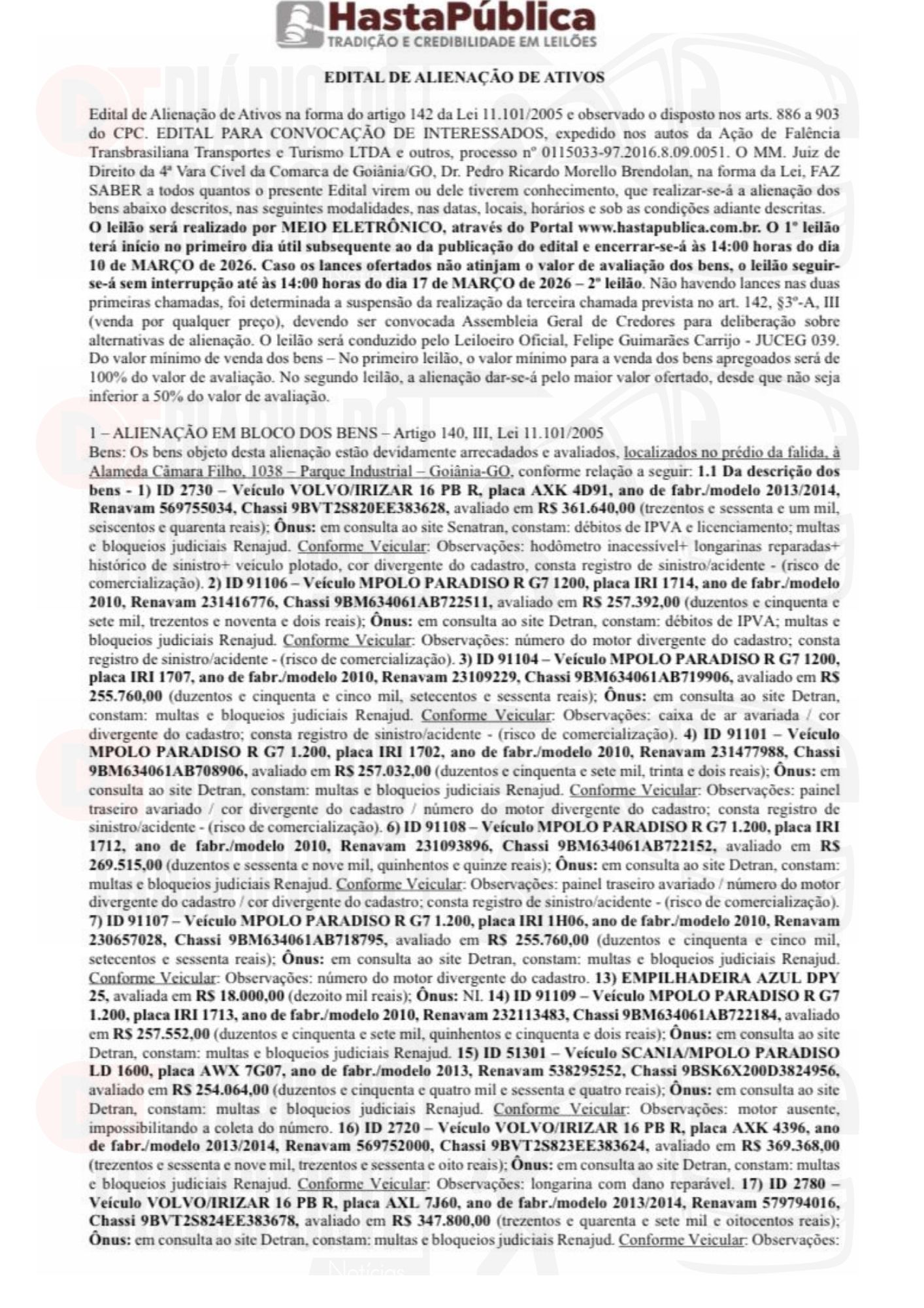A primeira praça, que é a primeira data para os lances, é no dia 10 de março de 2026. Já a segunda praça, com desconto de 50% nos lances mínimos sobre os bens não arrematados na primeira oportunidade, foi marcada para 17 de março de 2026.