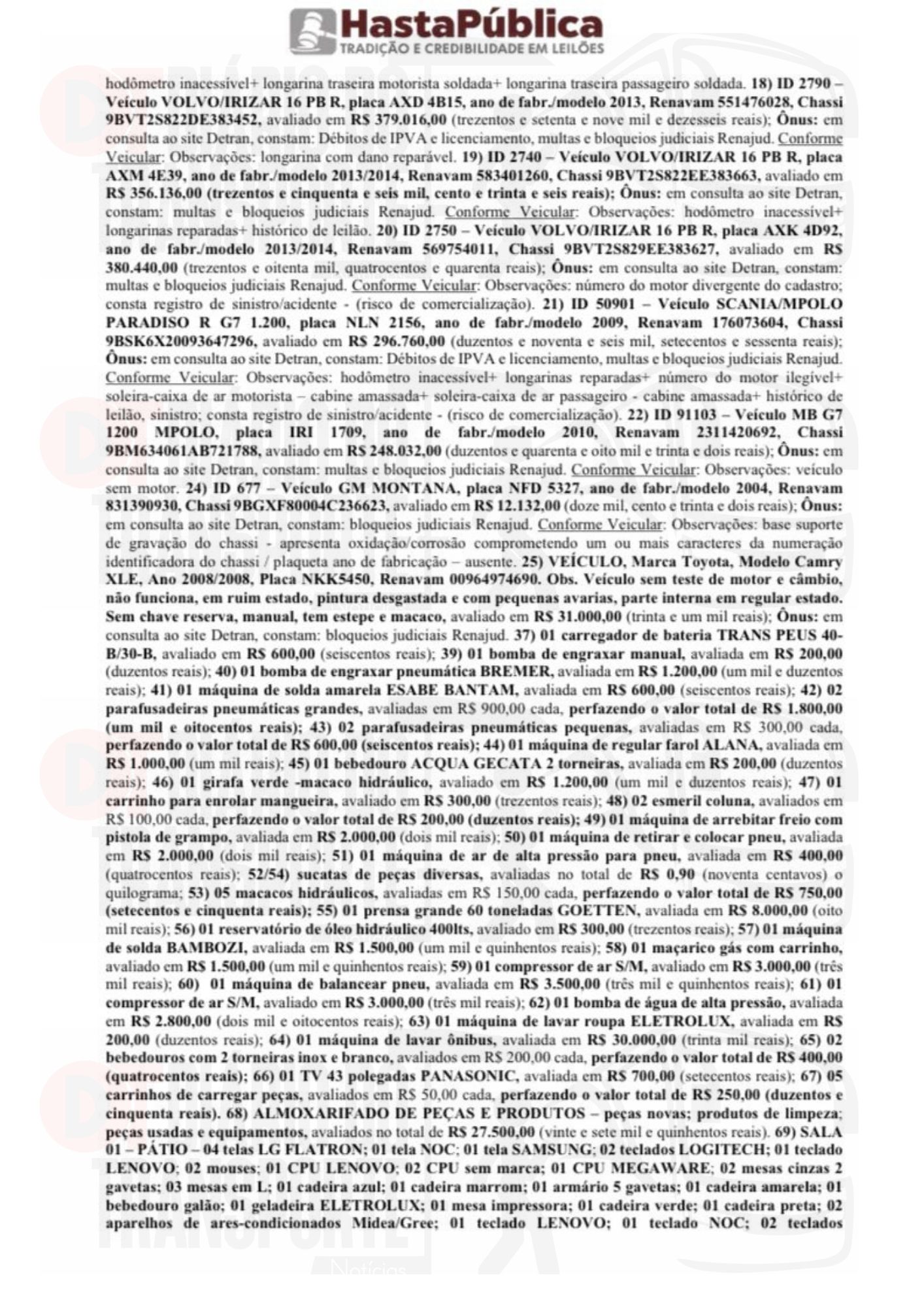 Há bens de maior valor, como um ônibus Volvo Irizar 16 PB R, ano/modelo 2013/2013, avaliado em R$ 379.016,00, e itens que não passam de R$ 500.