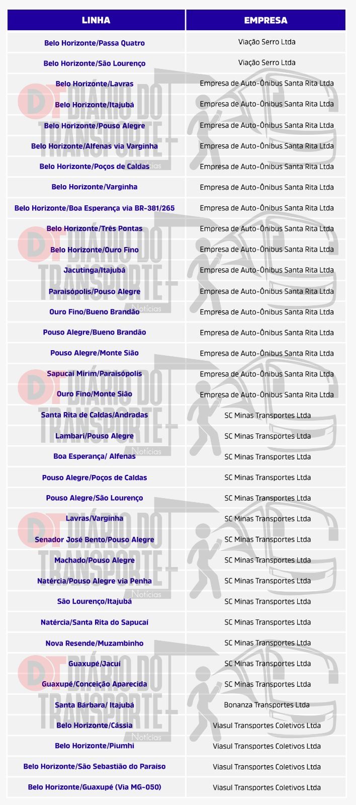 1050 – Belo Horizonte / Cássia, 1075 – Belo Horizonte / Poços de Caldas, 1119 -Belo Horizonte / São Sebastião do Paraíso.