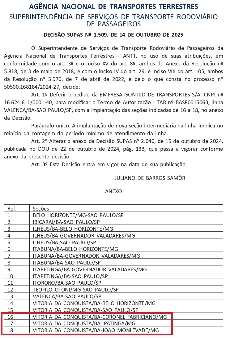 A Decisão SUPAS nº 1.509, datada de 14 de outubro de 2025, e publicada no Diário Oficial da União nesta terça-feira (21), autoriza a implantação de três novas seções intermediárias, todas com origem em Vitória da Conquista (BA) e destino a municípios mineiros, ampliando o atendimento no corredor Nordeste–Sudeste.
