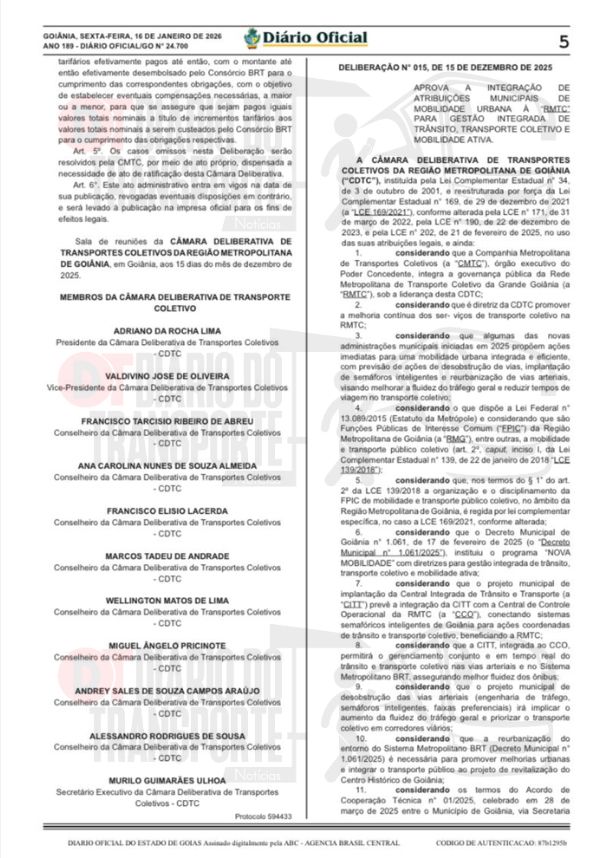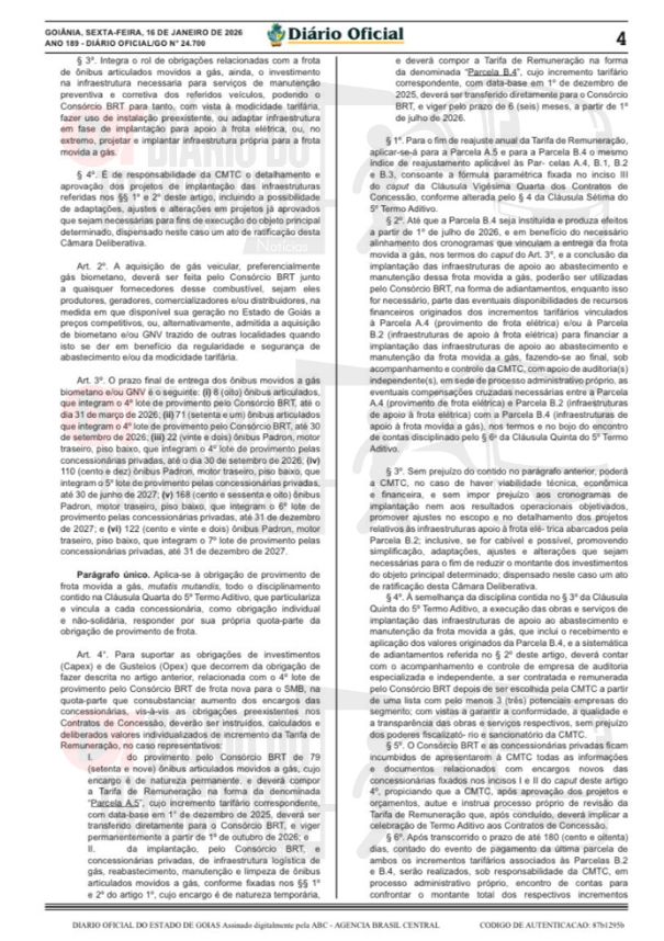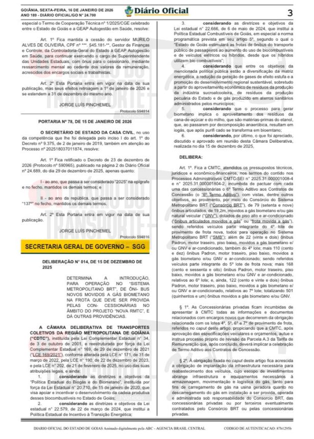 O Governo de Goiás publicou no Diário Oficial desta sexta-feira, 16 de janeiro de 2026, aditivo contratual com as empresas de ônibus para a implantação de 501 ônibus movidos a biometano (combustível obtido na decomposição de resíduos, conhecido como “gás de lixo”) e GNV (Gás Natural Veicular).