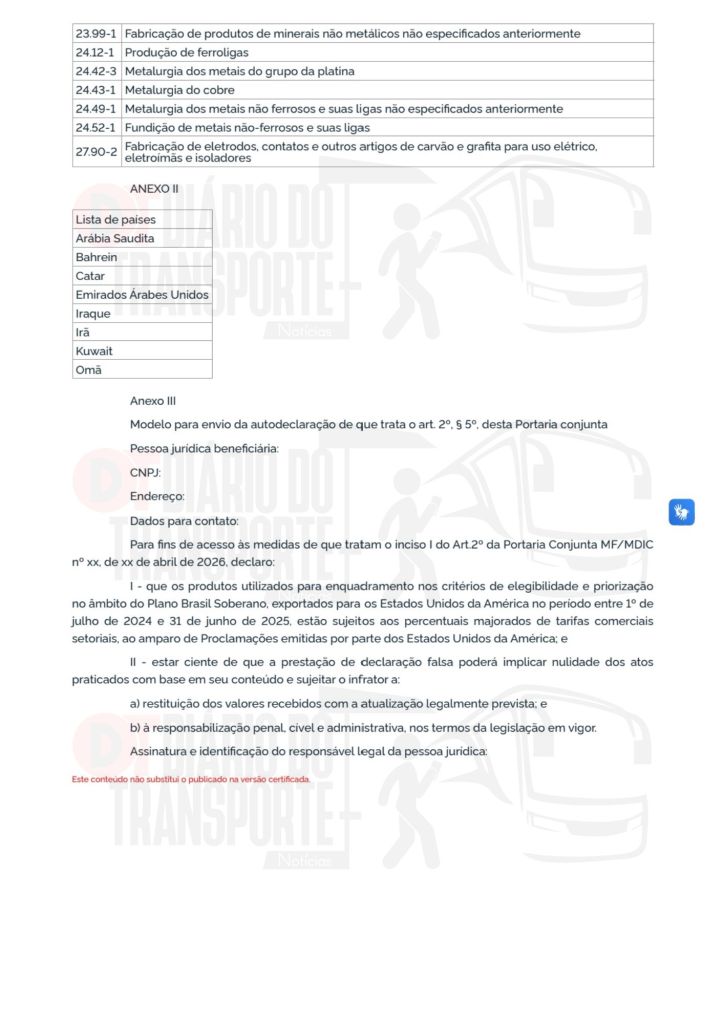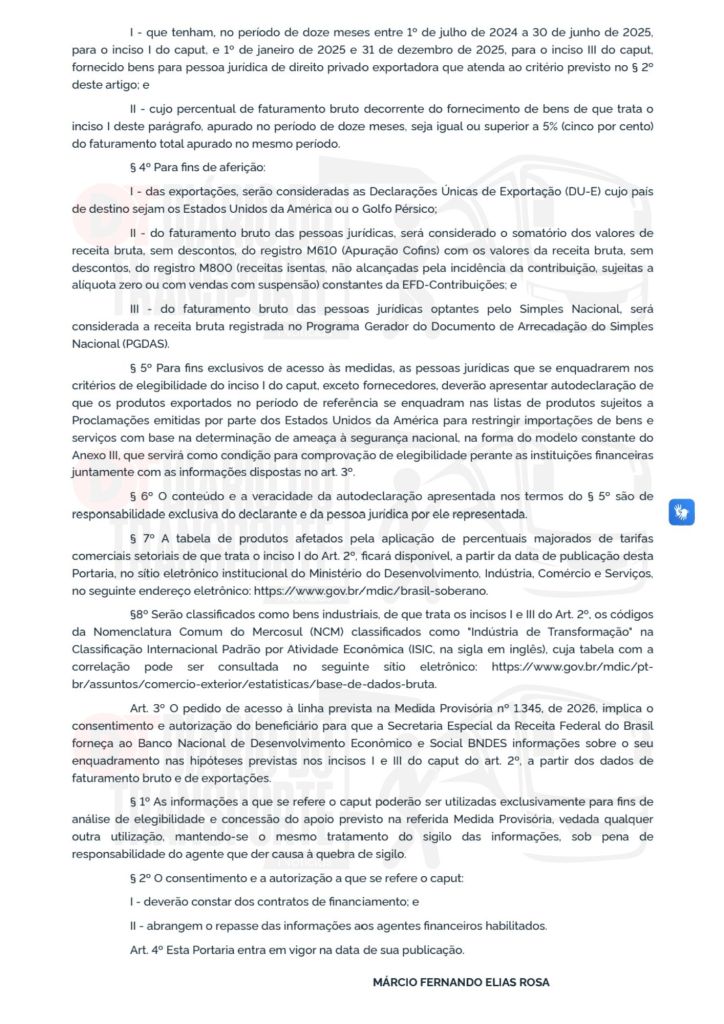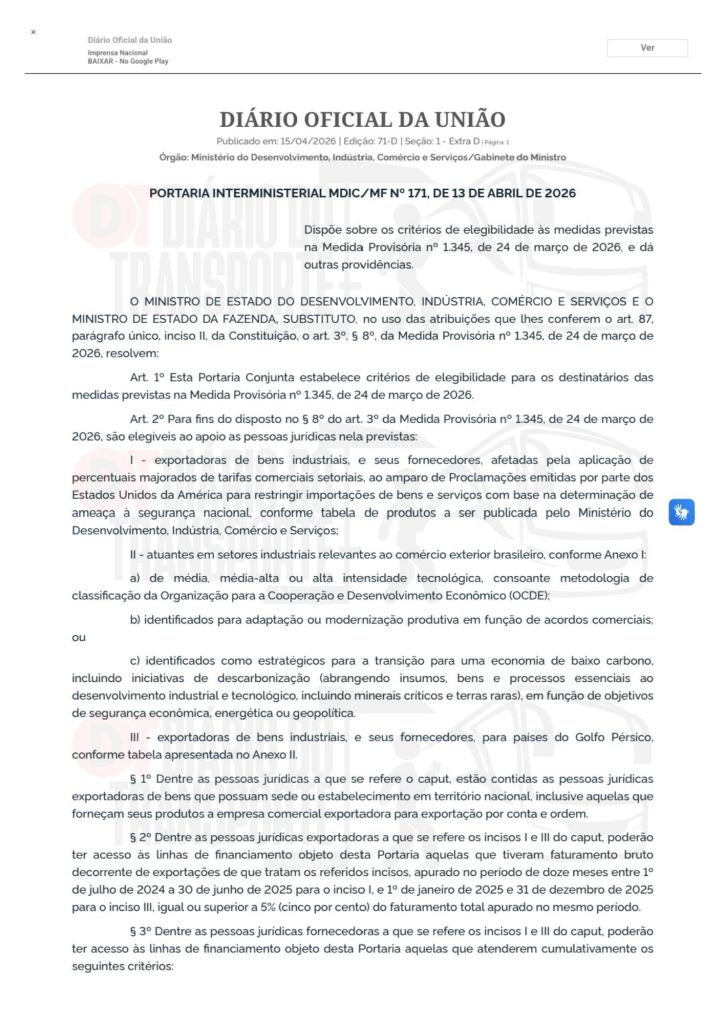 De acordo com a publicação oficial desta quinta-feira, 16 de abril de 2026, à qual o criador e editor-chefe do Diário do Transporte noticia em primeira-mão, são enquadradas na possibilidade de obtenção de financiamento, “empresas exportadoras de bens industriais, e seus fornecedores, afetadas pela aplicação de percentuais majorados de tarifas comerciais setoriais, ao amparo de Proclamações emitidas por parte dos Estados Unidos da América para restringir importações de bens e serviços com base na determinação de ameaça à segurança nacional, conforme tabela de produtos a ser publicada pelo Ministério do Desenvolvimento, Indústria, Comércio e Serviços; II – atuantes em setores industriais relevantes ao comércio exterior brasileiro,”