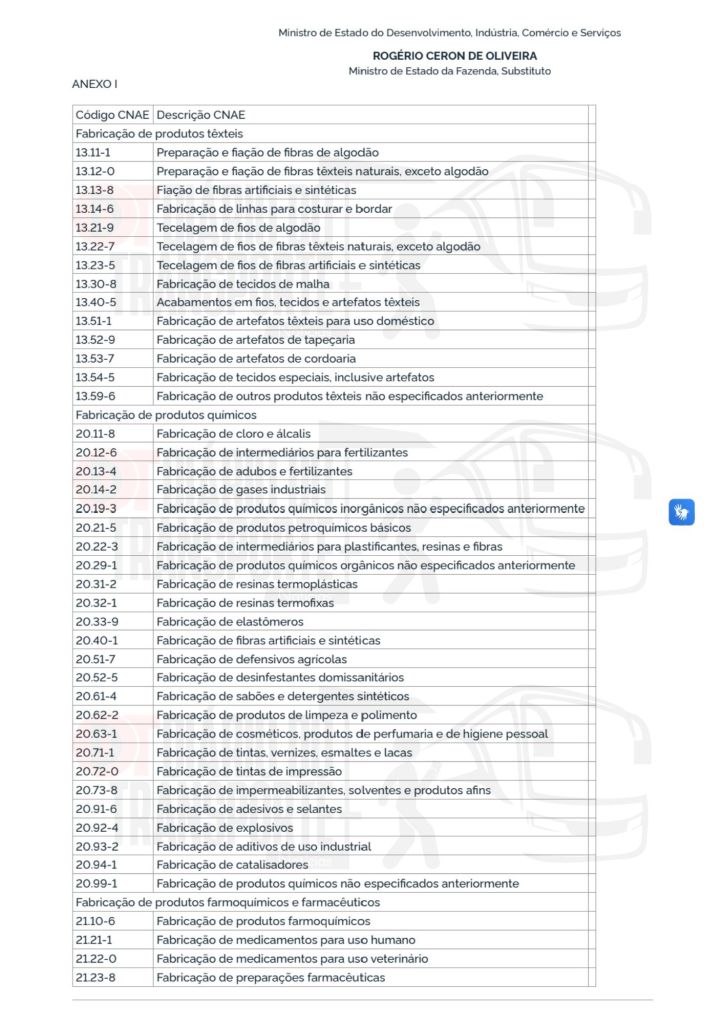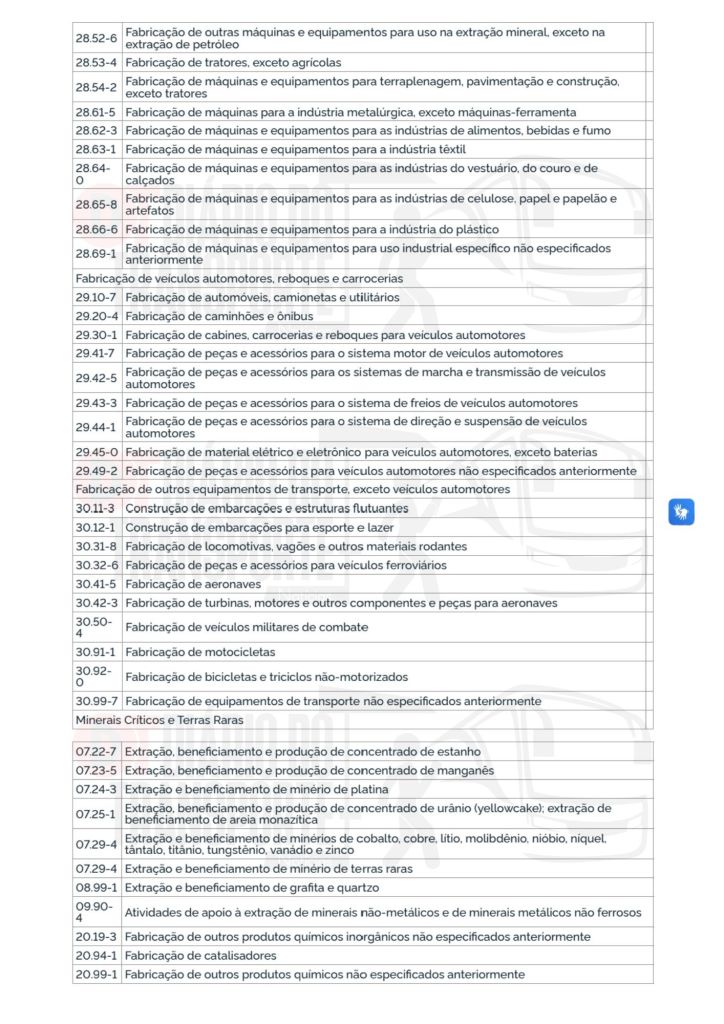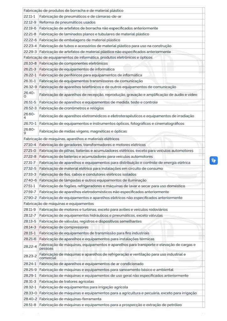 Entre os setores contemplados estão o de “fabricação de caminhões e ônibus” -Código CNAE (Classificação Nacional de Atividades Econômicas) – 29.20-4, com a seguinte classificação: