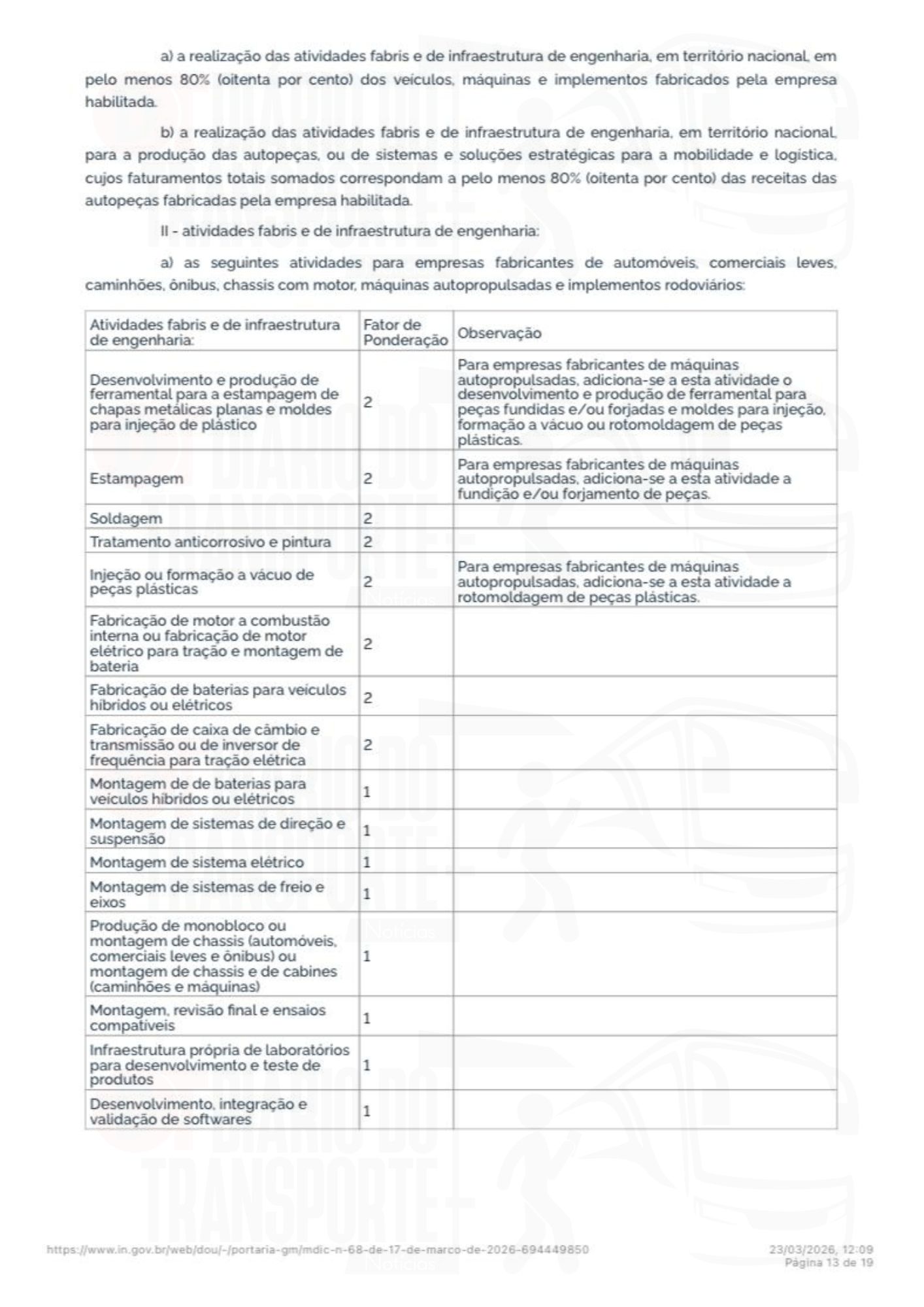 - a) as seguintes atividades para empresas fabricantes de automóveis, comerciais leves, caminhões, ônibus, chassis com motor, máquinas autopropulsadas e implementos rodoviários