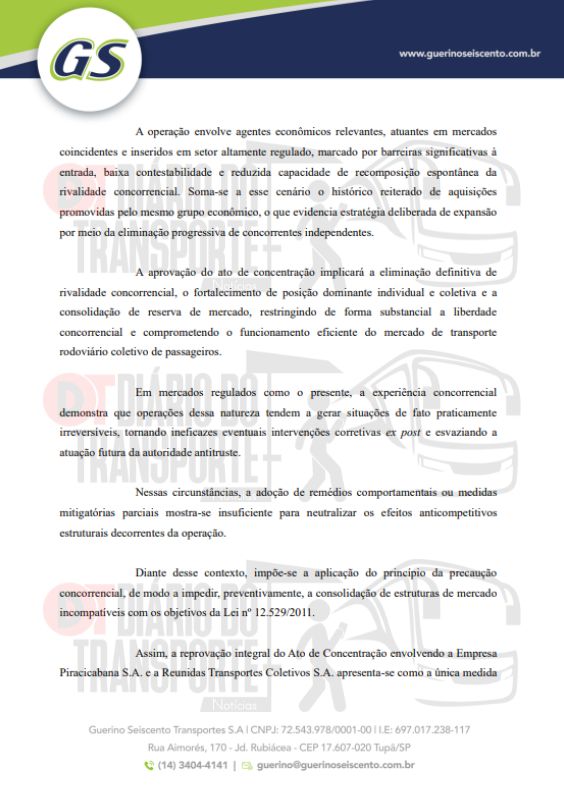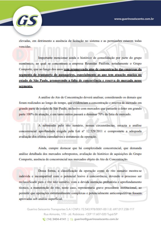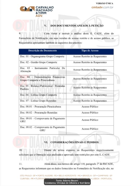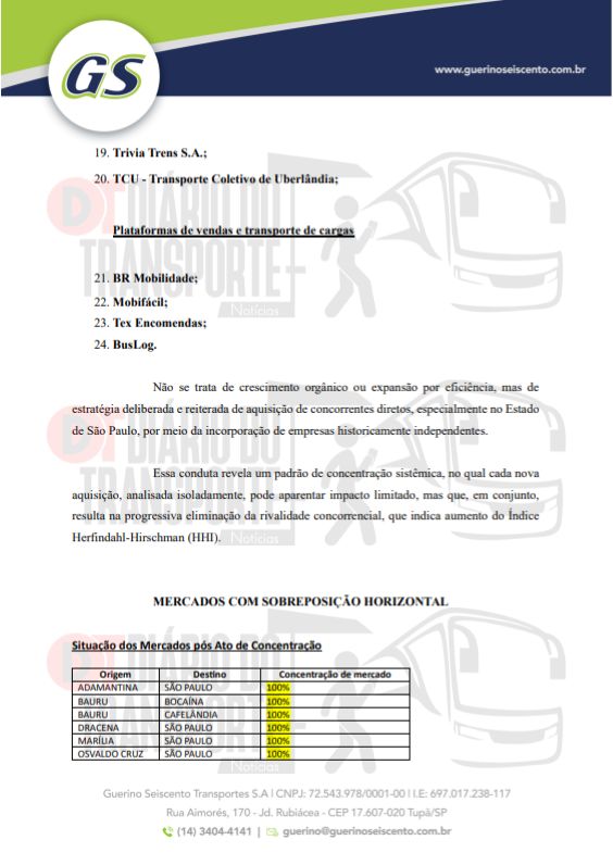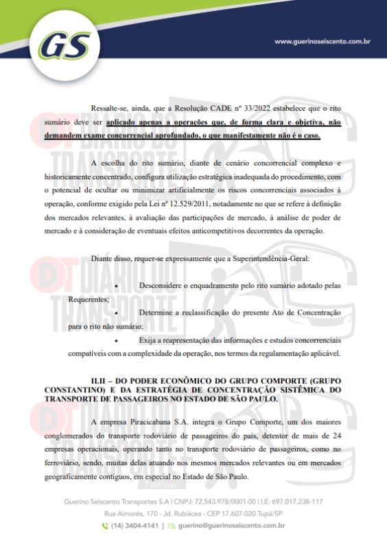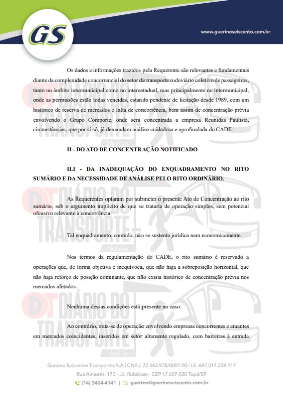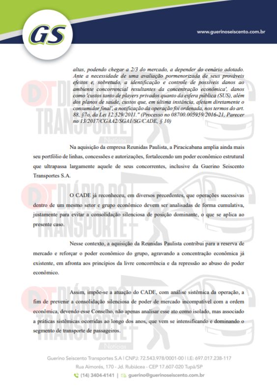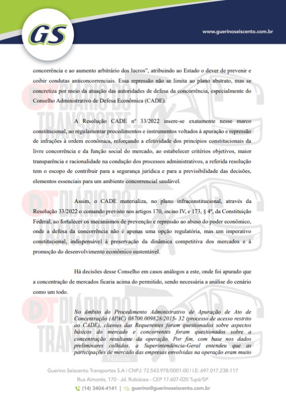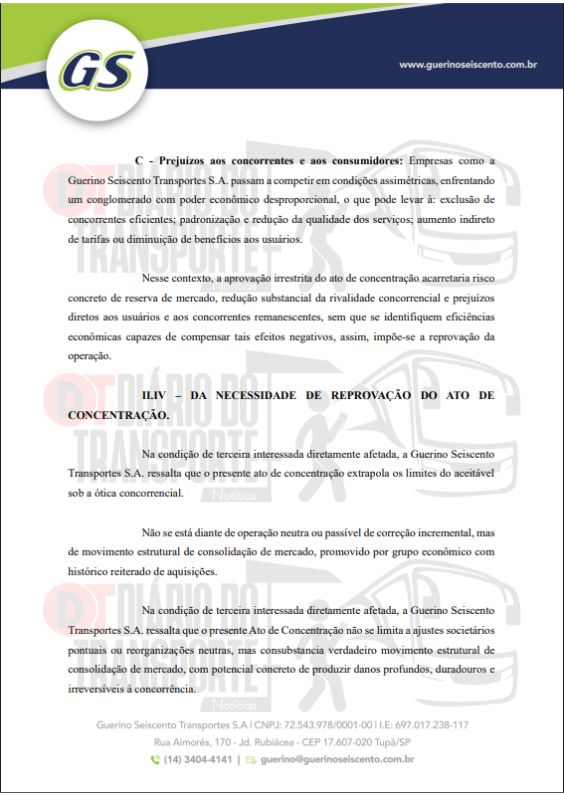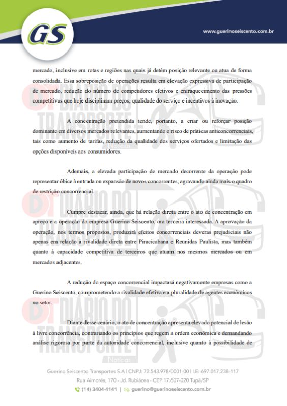 Ainda de acordo com o documento, assinado pelo advogado Daniel Elias do Nascimento, ao qual o Diário do Transporte teve acesso, “A Operação, portanto, resulta da decisão da Vendedora de sair do mercado e da decisão da Compradora de investir na Empresa-Alvo, promovendo uma simples substituição do agente econômico titular do controle da Empresa-Alvo”