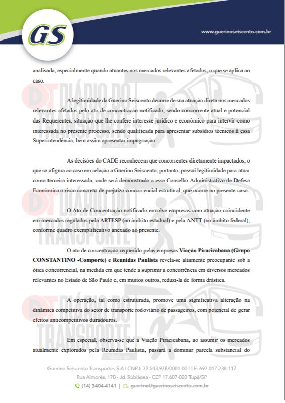 A empresa de ônibus rodoviários Guerino Seiscento, de Tupã, no interior paulista, pediu ao CADE (Conselho Administrativo de Defesa Econômica), órgão do MJ (Ministério da Justiça), que reprove a compra da Reunidas Paulista pela Viação Piracicabana, do Grupo Comporte, liderado pela família do fundador da GOL Linhas Aéreas, Constantino de Oliveira.