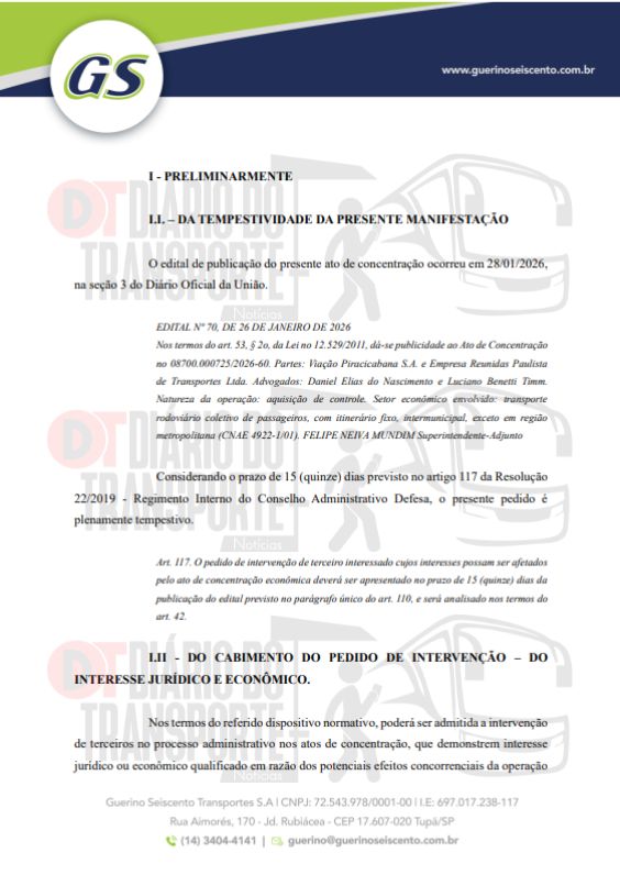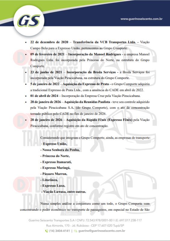 Como mostrou o Diário do Transporte, o órgão do Ministério da Justiça tornou público nesta quarta-feira, 28 de janeiro de 2026, o ato de concentração formado pela aquisição da Empresa Reunidas Paulista de Transportes Ltda pela Viação Piracicabana, do Grupo Comporte. A Piracicabana pede também para assumir a Expresso Fênix, outra empresa rodoviária da família Chedid, do interior de São Paulo.