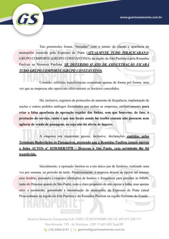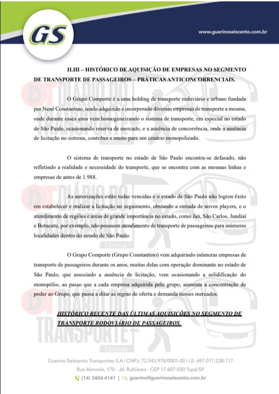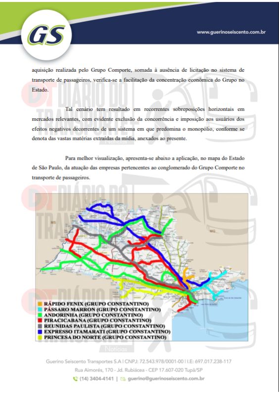 A Guerino Seiscento argumenta ao CADE que o Grupo Comporte tem este perfil de incorporações e concentração de mercado. A ações do conglomerado da família de Constantino de Oliveira resultam em operações que representam domínio de 70% a até 100% em alguns itinerários.