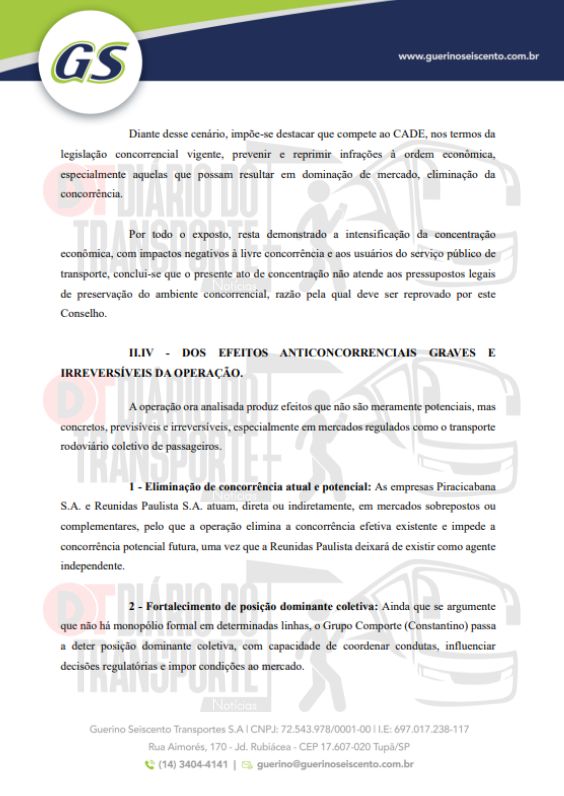 O ato de concentração requerido pelas empresas Viação Piracicabana (Grupo CONSTANTINO -Comporte) e Reunidas Paulista revela-se altamente preocupante sob a ótica concorrencial, na medida em que tende a suprimir a concorrência em diversos mercados relevantes no Estado de São Paulo e, em muitos outros, reduzi-la de forma drástica. A operação, tal como estruturada, promove uma significativa alteração na dinâmica competitiva do setor de transporte rodoviário de passageiros, com potencial de gerar efeitos anticompetitivos duradouros.