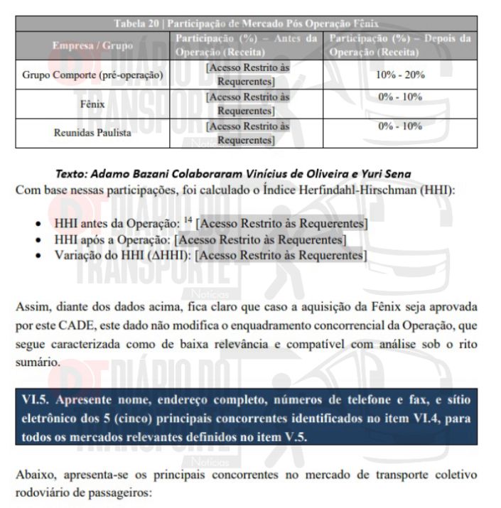 De acordo com os parâmetros do Guia do CADE, mercados com HHI entre 1.500 e 2.500 são classificados como moderadamente concentrados. Em tais mercados, preocupações concorrenciais tendem a surgir quando a variação do HHI é superior a 100 pontos. No caso concreto, a variação estimada é significativamente inferior a esse patamar, o que reforça a inexistência de preocupações concorrenciais relevantes decorrentes da Operação. Para fins de completude e transparência, a Compradora informa que recentemente notificou a este CADE outra operação neste mesmo mercado. Trata-se da operação de compra, pela Compradora, da Rápido Fênix Viação Ltda. (“Fênix”). A Compradoradestaca que muito embora aquela operação e esta tratam do mesmo mercado, elas são completamente independentes. Além disso, é importante destacar que a Fênix opera somente no mercado da ARTESP e não há qualquer sobreposição entre linhas operadas pela Fênix, com a Compradora ou com a Vendedora. Adicionalmente, em termos de volume de vendas, a Fênix faturou no sistema ARTESP, em 2024, [Acesso Restrito à Compradora]. Desta forma, ainda que a operação com a Fênix seja aprovada por este CADE, sob o ponto de vista concorrencial, ela não gerará impactos na análise da presente Operação