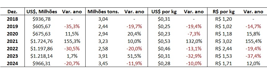 Apesar do recorde compra em 2024, os embarques em dezembro caíram frente ao valor observado no mesmo período de 2023 (segunda Tabela).