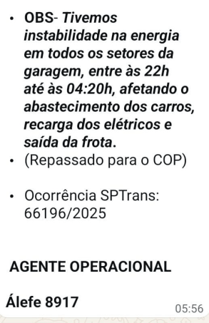 Situação perdurou das 22h de sexta-feira (14) até as 04h20 de hoje; setor operacional registrou ocorrência na SPTrans, e precisou remanejar veículos a diesel para suprir atendimento