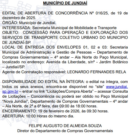 A Prefeitura de Jundiaí, no interior de São Paulo, publicou o edital da Concorrência Pública nº 16/2025 para a concessão dos serviços de transporte coletivo urbano de passageiros. As propostas serão abertas no dia 24 de fevereiro de 2026, às 10h, em sessão pública presencial no Paço Municipal.