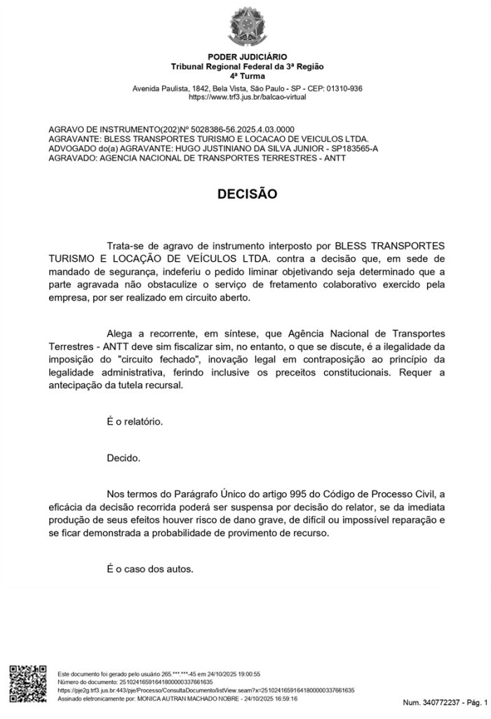 O Tribunal Regional Federal da 3ª Região (TRF3) — com sede em São Paulo e jurisdição sobre os estados de São Paulo e Mato Grosso do Sul — concedeu liminar à Bless Transportes Turismo e Locação de Veículos Ltda., suspendendo os efeitos da decisão que havia indeferido o pedido da empresa para operar no modelo de fretamento colaborativo em circuito aberto.