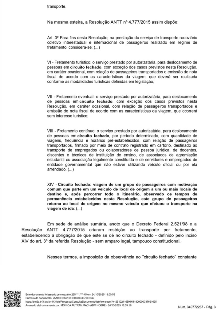 Naquele processo, a Inova argumentava que a imposição do circuito fechado configurava uma “inovação legal” sem base na legislação, violando o princípio da legalidade administrativa e preceitos constitucionais. A magistrada concordou, apontando que tanto o Decreto nº 2.521/98 quanto a Resolução ANTT nº 4.777/2015 impuseram restrições além do que a lei autoriza, e que o conceito de circuito fechado — a viagem de um grupo de passageiros que parte de um local de origem para um ou mais destinos e retorna ao mesmo ponto — carece de respaldo legal.