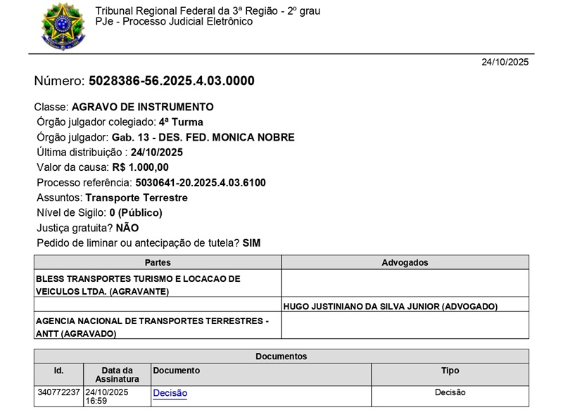 O agravo de instrumento foi interposto pela Bless contra decisão em mandado de segurança que havia mantido a restrição imposta pela Agência Nacional de Transportes Terrestres (ANTT). A magistrada, no entanto, entendeu que há fundamento jurídico consistente e risco de dano grave para a empresa caso fosse impedida de operar.