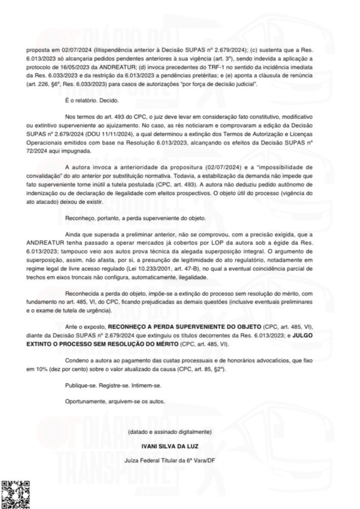 A decisão, assinada pela juíza federal Ivani Silva da Luz em 14 de outubro de 2025, reconheceu a “perda superveniente do objeto” — termo jurídico usado quando um fato novo torna desnecessário o prosseguimento da ação. No caso, o fato foi a revogação, pela própria ANTT, da autorização da Arca Turismo que motivava o processo.
