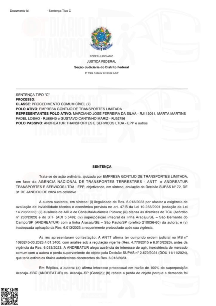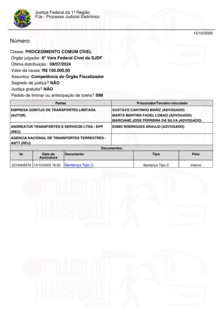 A 6ª Vara Federal Cível do Distrito Federal julgou extinta, sem resolução do mérito, a ação movida pela Empresa Gontijo de Transportes contra a Agência Nacional de Transportes Terrestres (ANTT) e a Arca Turismo e Serviços, nome fantasia da Andreatur Transportes, que discutia a operação da linha Aracaju (SE) – São Bernardo do Campo (SP).